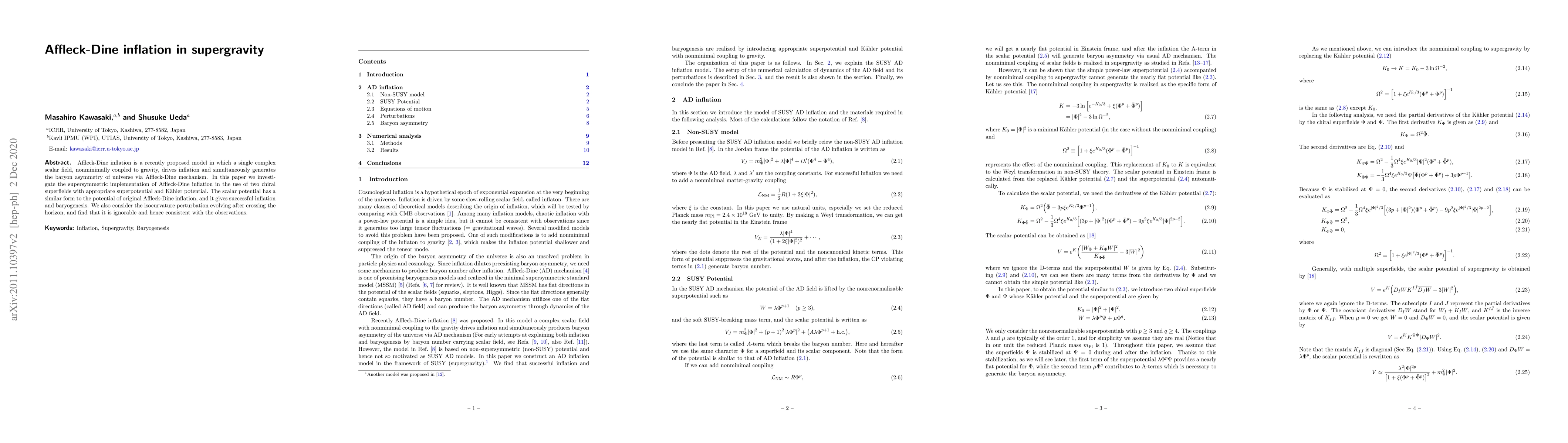 This paper explores a supersymmetric version of Affleck-Dine inflation using two chiral superfields, demonstrating successful inflation and baryogenesis while showing that post-horizon isocurvature perturbations are negligible, thus consistent with observational data.