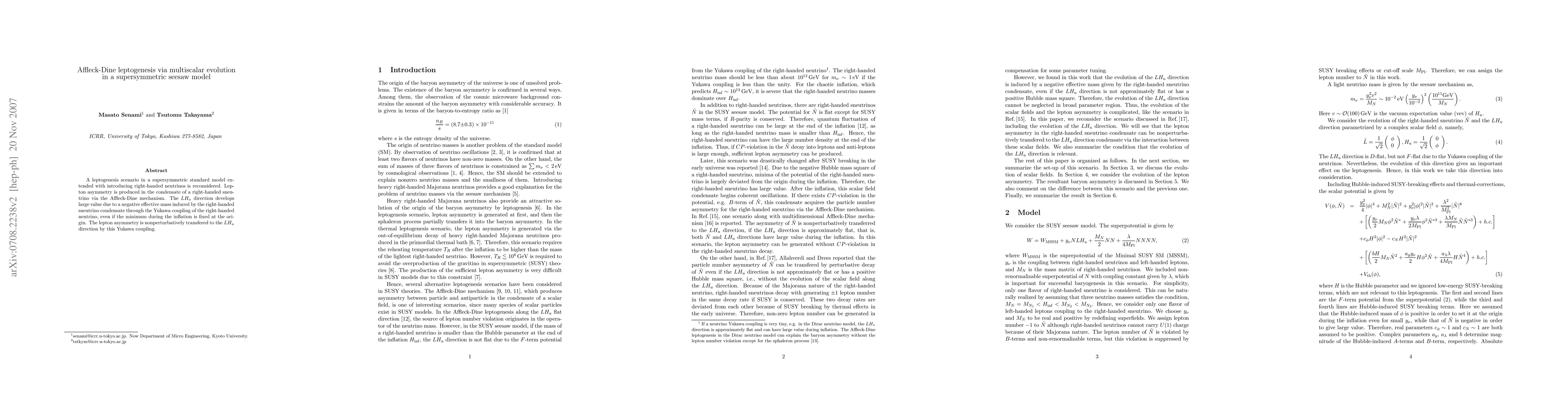 Summary: This paper explores Affleck-Dine leptogenesis in a supersymmetric seesaw model where lepton asymmetry is generated via a right-handed sneutrino condensate. The LH_u direction acquires a large value due to a negative effective mass, leading to nonperturbative transfer of lepton asymmetry through the Yukawa coupling of right-handed neutrinos.