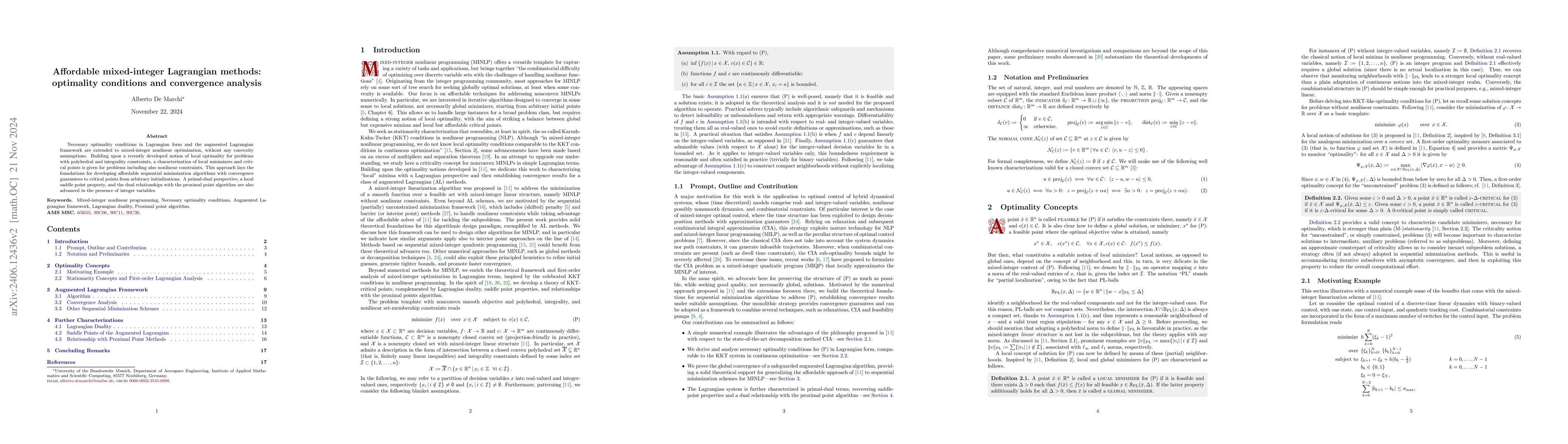 The paper extends necessary optimality conditions and augmented Lagrangian frameworks to mixed-integer nonlinear optimization without convexity assumptions. It introduces a primal-dual perspective and lays the groundwork for affordable sequential minimization algorithms with convergence guarantees to critical points from any starting point.