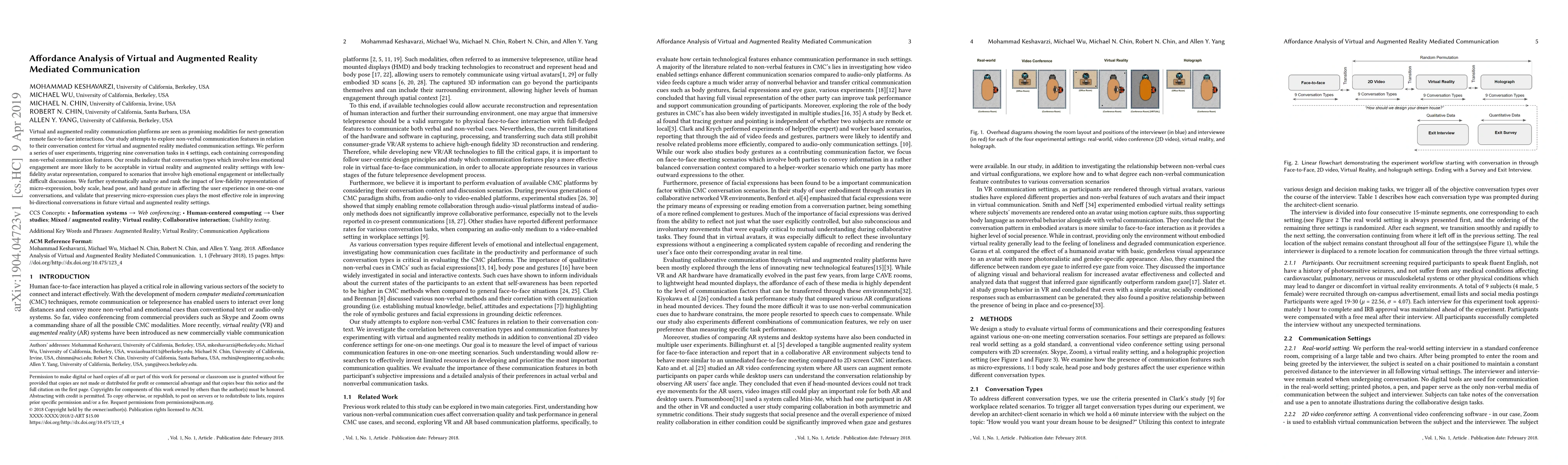 This study investigates non-verbal communication features in virtual and augmented reality communication, finding that less emotionally engaging conversations are more acceptable in low-fidelity settings. The research highlights that micro-expression cues are most effective in enhancing bi-directional interactions in future VR and AR environments.