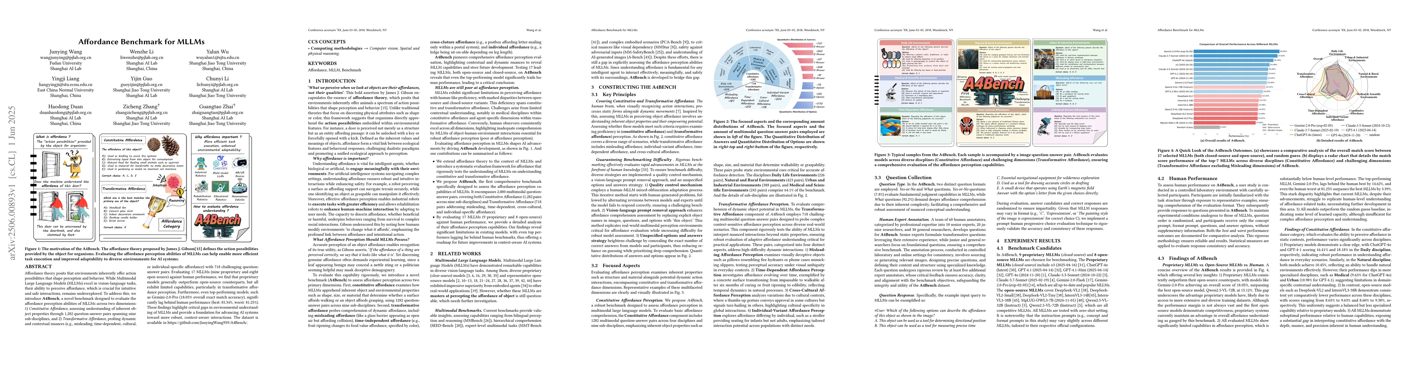 A new benchmark, A4Bench, evaluates MLLMs' ability to perceive affordance in environments, finding that proprietary models generally outperform open-source counterparts but still lag behind human performance.