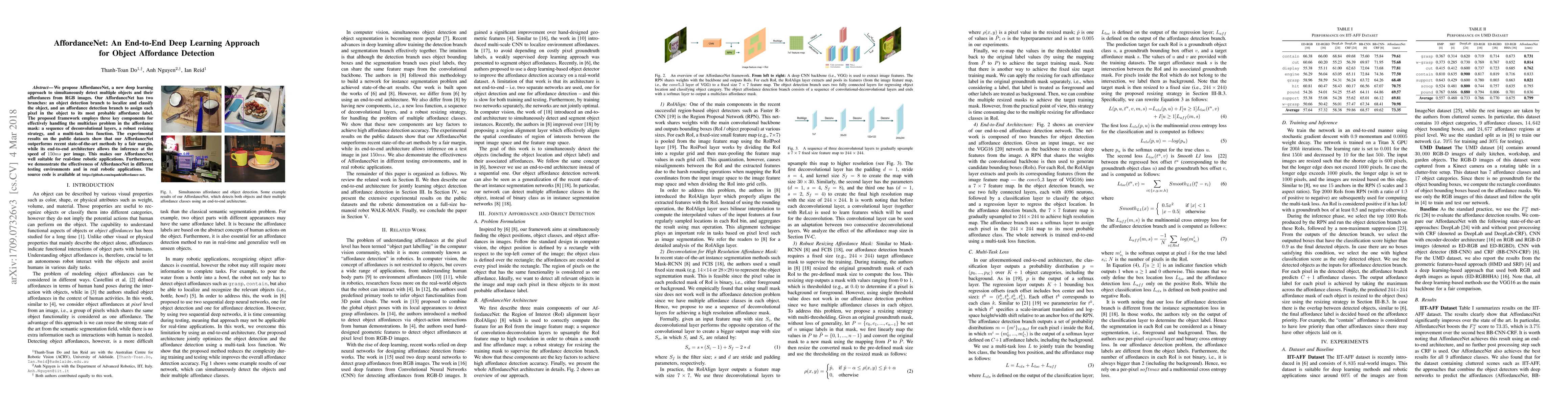 AffordanceNet is a deep learning framework for detecting objects and their affordances in RGB images, featuring two branches for object detection and affordance assignment. It outperforms recent methods and is suitable for real-time robotic applications due to its fast inference speed.