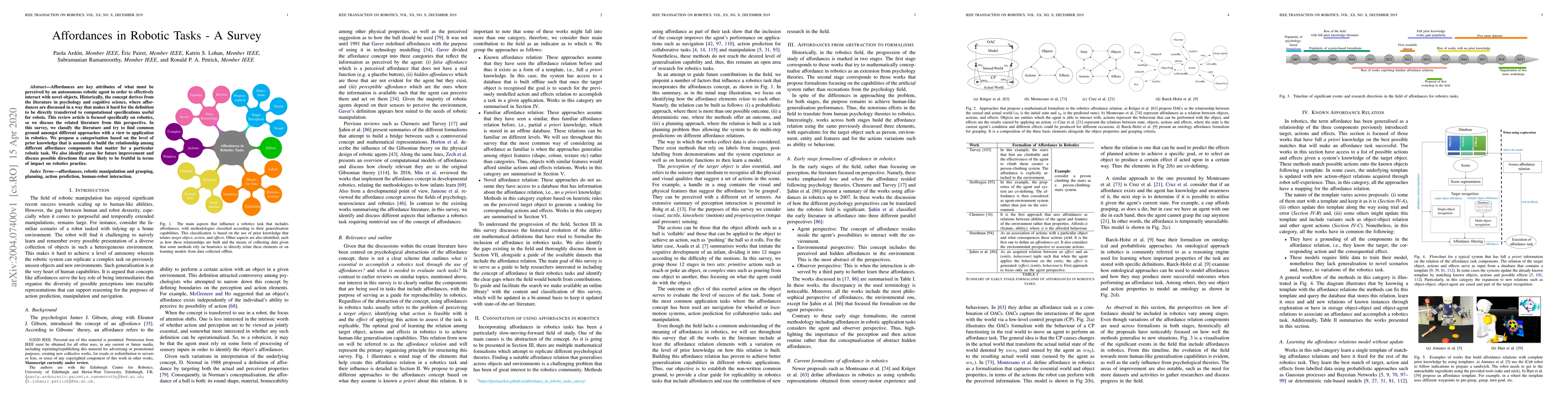 This survey explores the concept of affordances in robotics, classifying literature based on the level of prior knowledge required for robotic interaction with objects. It identifies common approaches and suggests future research directions to enhance robotic task performance.