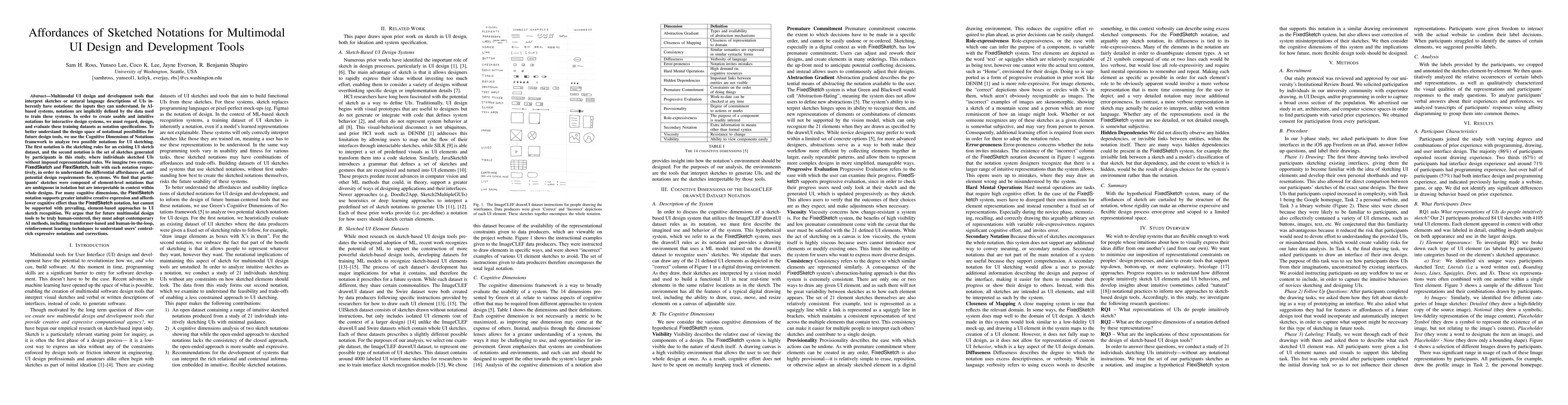 Multimodal UI design and development tools that interpret sketches or natural language descriptions of UIs inherently have notations: the inputs they can understand. In AI-based systems, notations are implicitly defined by the data used to train these systems. In order to create usable and intuitive notations for interactive design systems, we must regard, design, and evaluate these training datasets as notation specifications. To better understand the design space of notational possibilities for future design tools, we use the Cognitive Dimensions of Notations framework to analyze two possible notations for UI sketching. The first notation is the sketching rules for an existing UI sketch dataset, and the second notation is the set of sketches generated by participants in this study, where individuals sketched UIs without imposed representational rules. We imagine two systems, FixedSketch and FlexiSketch, built with each notation respectively, in order to understand the differential affordances of, and potential design requirements for, systems. We find that participants' sketches were composed of element-level notations that are ambiguous in isolation but are interpretable in context within whole designs. For many cognitive dimensions, the FlexiSketch notation supports greater intuitive creative expression and affords lower cognitive effort than the FixedSketch notation, but cannot be supported with prevailing, element-based approaches to UI sketch recognition. We argue that for future multimodal design tools to be truly human-centered, they must adopt contemporary AI methods, including transformer-based and human-in-the-loop, reinforcement learning techniques to understand users' context-rich expressive notations and corrections.