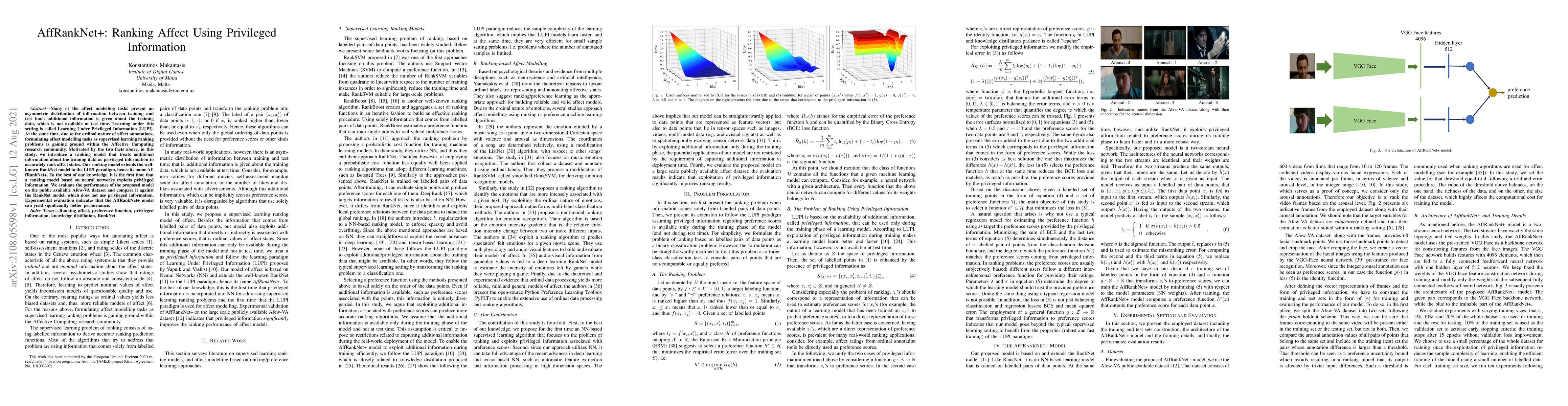 Many of the affect modelling tasks present an asymmetric distribution of information between training and test time; additional information is given about the training data, which is not available at test time. Learning under this setting is called Learning Under Privileged Information (LUPI). At the same time, due to the ordinal nature of affect annotations, formulating affect modelling tasks as supervised learning ranking problems is gaining ground within the Affective Computing research community. Motivated by the two facts above, in this study, we introduce a ranking model that treats additional information about the training data as privileged information to accurately rank affect states. Our ranking model extends the well-known RankNet model to the LUPI paradigm, hence its name AffRankNet+. To the best of our knowledge, it is the first time that a ranking model based on neural networks exploits privileged information. We evaluate the performance of the proposed model on the public available Afew-VA dataset and compare it against the RankNet model, which does not use privileged information. Experimental evaluation indicates that the AffRankNet+ model can yield significantly better performance.