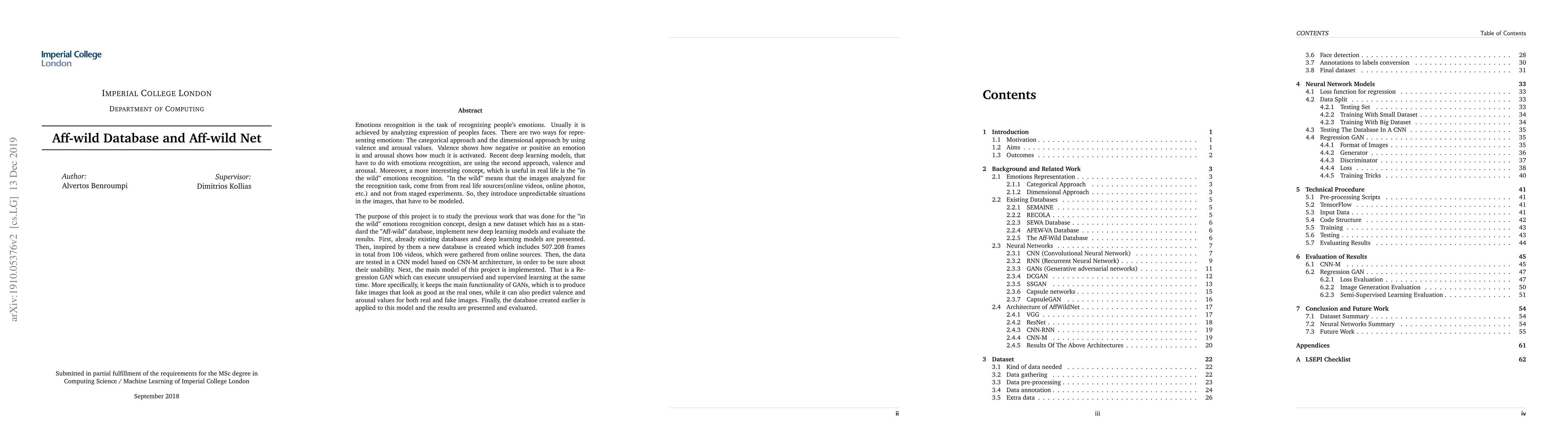This paper introduces the Aff-Wild database and AffWild Net, focusing on "in the wild" emotions recognition using valence and arousal values. The study creates a new dataset of 507,208 frames from 106 videos sourced online, and evaluates it using a CNN model and a Regression GAN for unsupervised and supervised learning to predict emotions.