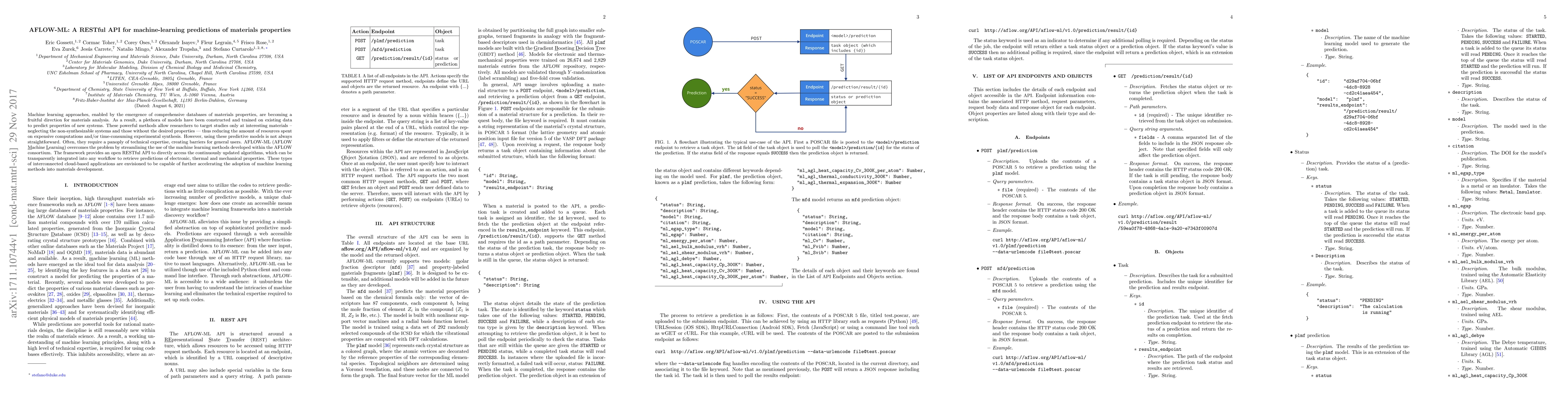 AFLOW-ML offers a RESTful API for machine-learning predictions of materials properties, simplifying access to advanced predictive models and reducing barriers for general users. It integrates continuously updated algorithms to provide predictions of electronic, thermal, and mechanical properties, facilitating the adoption of machine learning in materials development.