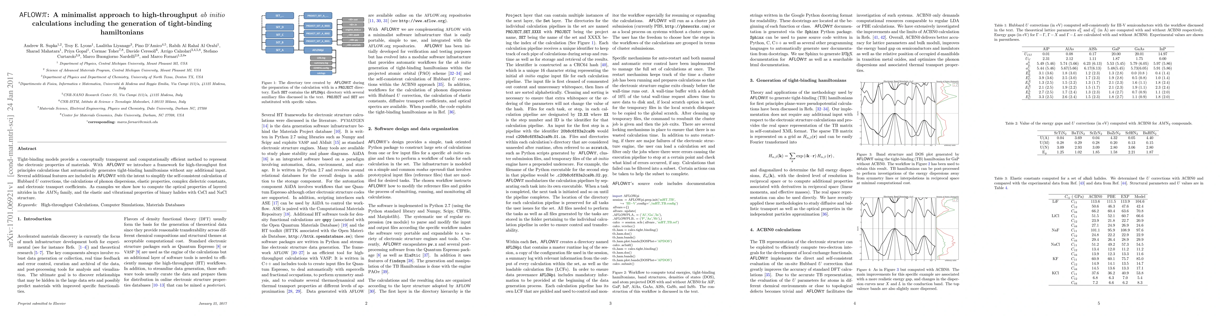 AFLOW$\pi$ is a high-throughput framework for ab initio calculations that automatically generates tight-binding hamiltonians, simplifying the computation of electronic properties, phonon dispersions, and transport coefficients for materials like layered nitrides and binary halides.