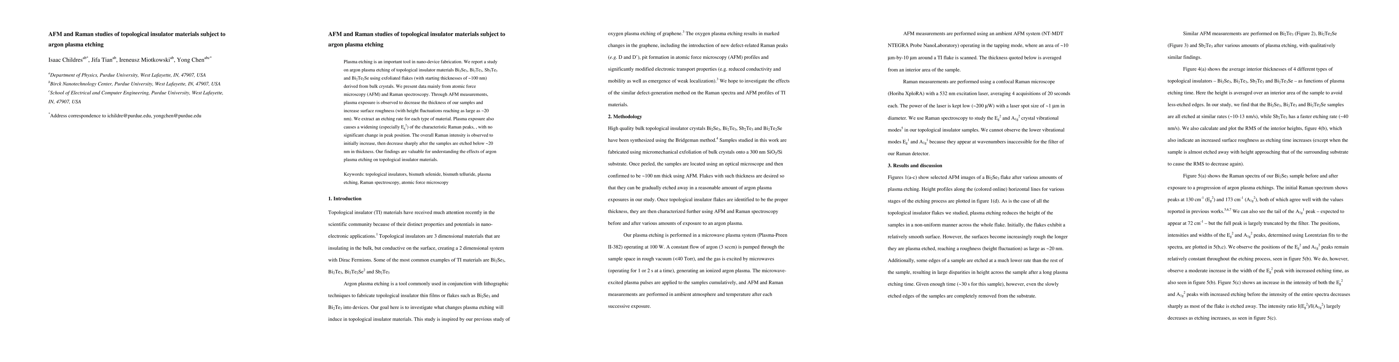 This study investigates the impact of argon plasma etching on topological insulator materials using AFM and Raman spectroscopy. AFM reveals decreased thickness and increased surface roughness due to plasma exposure, while Raman spectroscopy shows peak widening and a sharp decrease in intensity after etching below ~20 nm.
