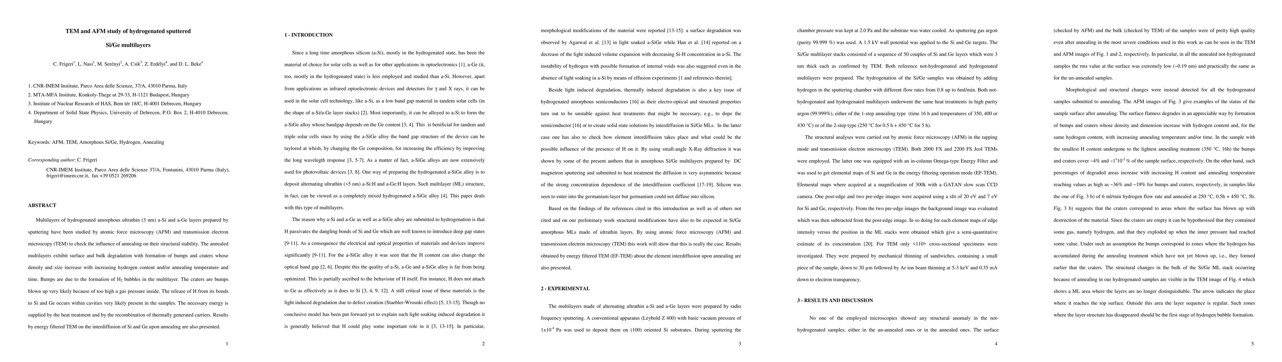 Multilayers of hydrogenated ultrathin (3 nm) amorphous a-Si and a-Ge layers prepared by sputtering have been studied by atomic force microscopy (AFM) and transmission electron microscopy (TEM) to check the influence of annealing on their structural stability. The annealed multilayers exhibit surface and bulk degradation with formation of bumps and craters whose density and size increase with increasing hydrogen content and/or annealing temperature and time. Bumps are due to the formation of H2 bubbles in the multilayer. The craters are bumps blown up very likely because of too high a gas pressure inside. The release of H from its bonds to Si and Ge occurs within cavities very likely present in the samples. The necessary energy is supplied by the heat treatment and by the recombination of thermally generated carriers. Results by energy filtered TEM on the interdiffusion of Si and Ge upon annealing are also presented.
