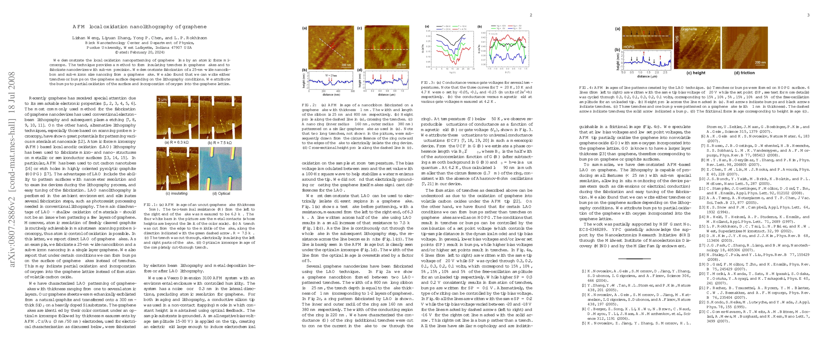 This paper presents an atomic force microscope (AFM) technique for local oxidation nanolithography of graphene, enabling the creation of insulating trenches and nanodevices with sub-nanometer precision. The method can produce both trenches and bumps, the latter attributed to partial oxidation and oxygen incorporation into the graphene lattice.
