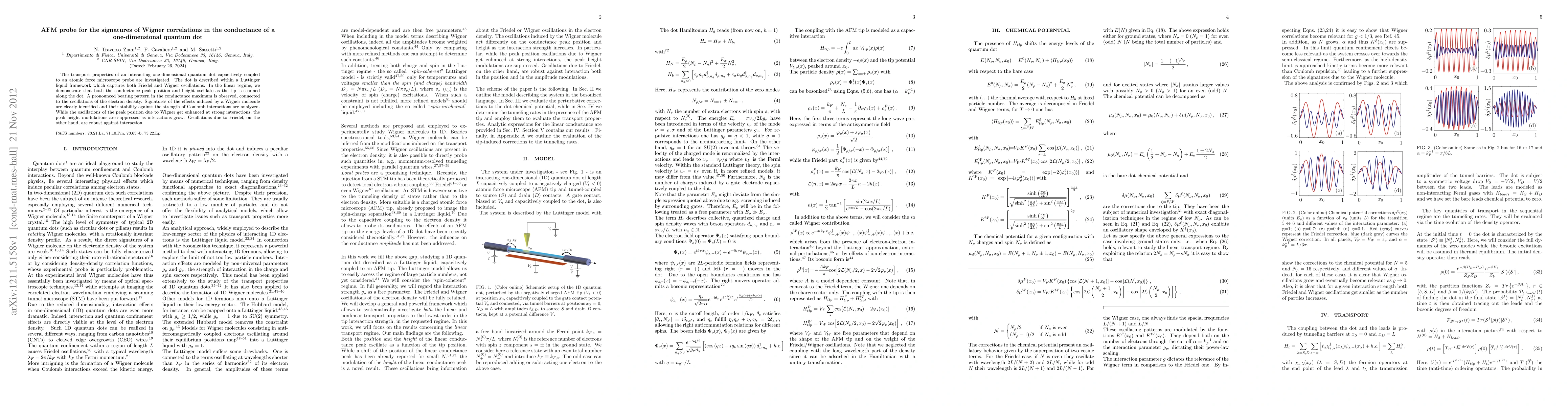 This paper investigates the transport properties of a one-dimensional quantum dot coupled to an AFM probe, revealing oscillations in conductance peaks due to both Friedel and Wigner correlations. The study identifies signatures of Wigner molecule effects, showing enhanced peak position oscillations but suppressed peak height modulations with stronger Coulomb interactions.