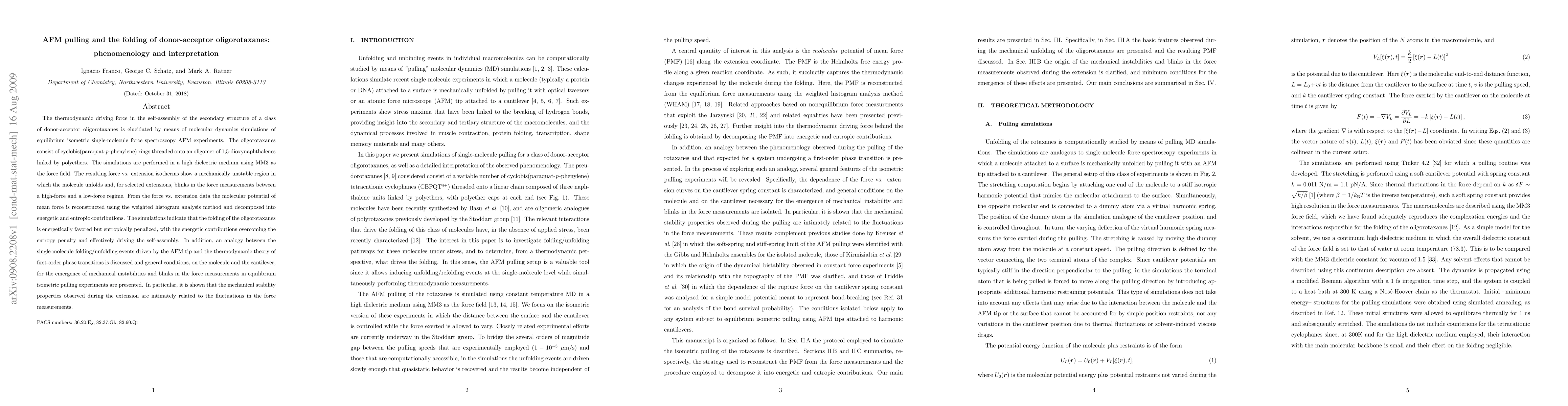 The thermodynamic driving force in the self-assembly of the secondary structure of a class of donor-acceptor oligorotaxanes is elucidated by means of molecular dynamics simulations of equilibrium isometric single-molecule force spectroscopy AFM experiments. The oligorotaxanes consist of cyclobis(paraquat-\emph{p}-phenylene) rings threaded onto an oligomer of 1,5-dioxynaphthalenes linked by polyethers. The simulations are performed in a high dielectric medium using MM3 as the force field. The resulting force vs. extension isotherms show a mechanically unstable region in which the molecule unfolds and, for selected extensions, blinks in the force measurements between a high-force and a low-force regime. From the force vs. extension data the molecular potential of mean force is reconstructed using the weighted histogram analysis method and decomposed into energetic and entropic contributions. The simulations indicate that the folding of the oligorotaxanes is energetically favored but entropically penalized, with the energetic contributions overcoming the entropy penalty and effectively driving the self-assembly. In addition, an analogy between the single-molecule folding/unfolding events driven by the AFM tip and the thermodynamic theory of first-order phase transitions is discussed and general conditions, on the molecule and the cantilever, for the emergence of mechanical instabilities and blinks in the force measurements in equilibrium isometric pulling experiments are presented. In particular, it is shown that the mechanical stability properties observed during the extension are intimately related to the fluctuations in the force measurements.