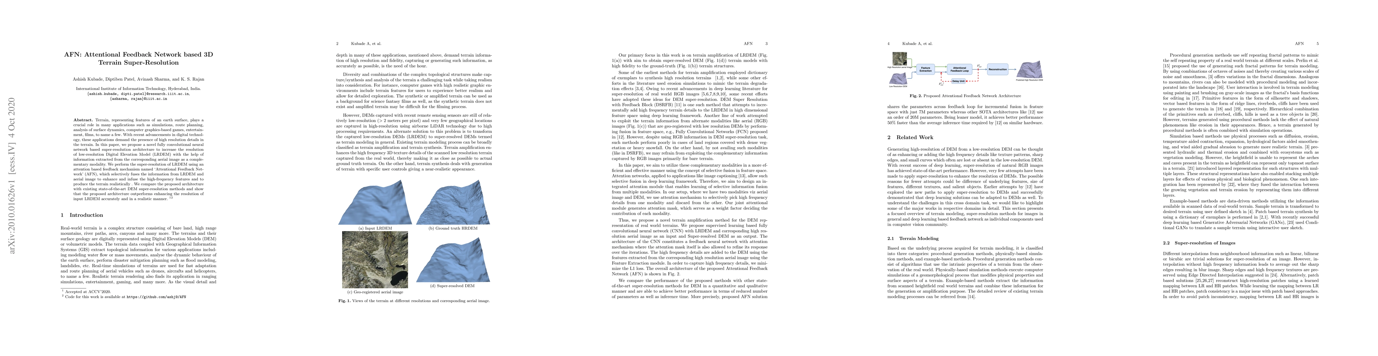 Terrain, representing features of an earth surface, plays a crucial role in many applications such as simulations, route planning, analysis of surface dynamics, computer graphics-based games, entertainment, films, to name a few. With recent advancements in digital technology, these applications demand the presence of high-resolution details in the terrain. In this paper, we propose a novel fully convolutional neural network-based super-resolution architecture to increase the resolution of low-resolution Digital Elevation Model (LRDEM) with the help of information extracted from the corresponding aerial image as a complementary modality. We perform the super-resolution of LRDEM using an attention-based feedback mechanism named 'Attentional Feedback Network' (AFN), which selectively fuses the information from LRDEM and aerial image to enhance and infuse the high-frequency features and to produce the terrain realistically. We compare the proposed architecture with existing state-of-the-art DEM super-resolution methods and show that the proposed architecture outperforms enhancing the resolution of input LRDEM accurately and in a realistic manner.
