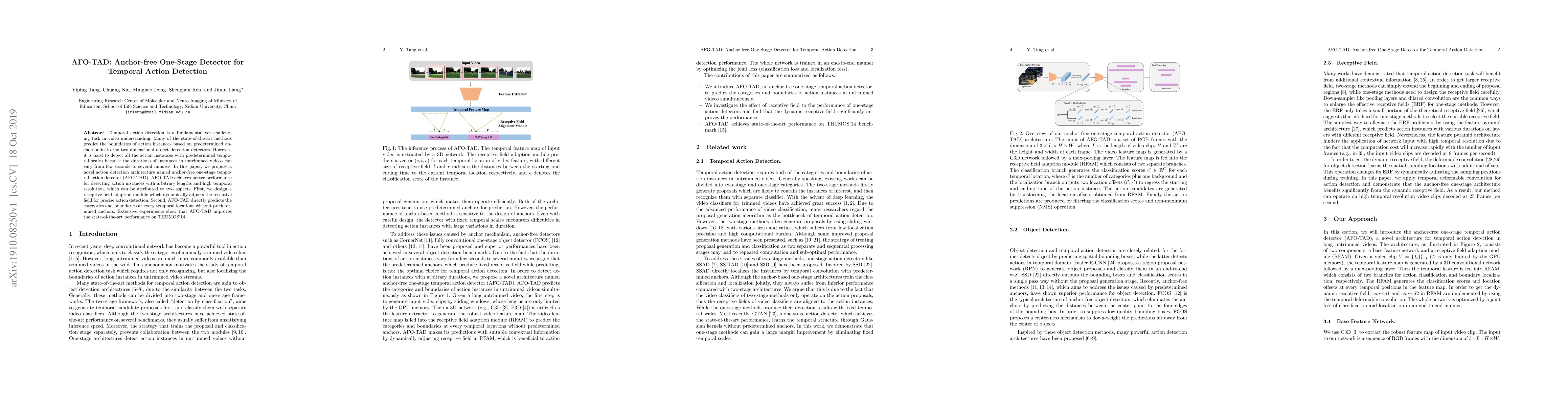 The paper introduces AFO-TAD, an anchor-free one-stage temporal action detector that dynamically adjusts its receptive field and directly predicts action categories and boundaries without predefined anchors, achieving superior performance for detecting actions of varying lengths. Experimental results demonstrate AFO-TAD's state-of-the-art performance on the THUMOS'14 dataset.