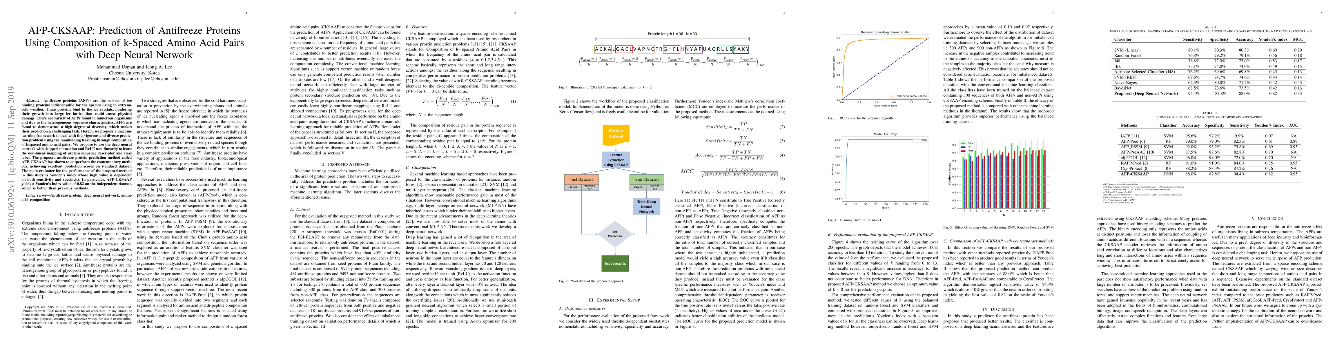 This paper proposes AFP-CKSAAP, a machine learning framework using deep neural networks to predict antifreeze proteins (AFPs) based on the composition of k-spaced amino acid pairs. The method outperforms existing techniques, achieving a Youden's index value of 0.82, demonstrating high sensitivity and specificity.