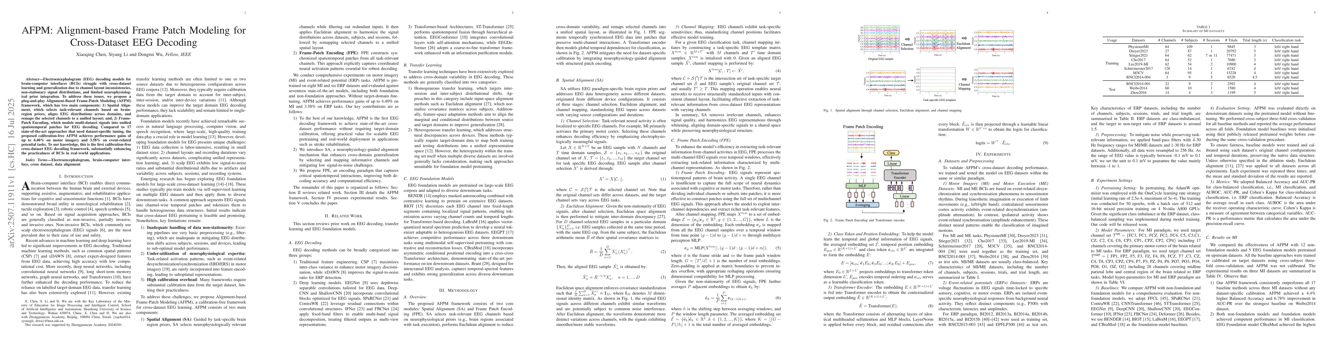 Electroencephalogram (EEG) decoding models for brain-computer interfaces (BCIs) struggle with cross-dataset learning and generalization due to channel layout inconsistencies, non-stationary signal distributions, and limited neurophysiological prior integration. To address these issues, we propose a plug-and-play Alignment-Based Frame-Patch Modeling (AFPM) framework, which has two main components: 1) Spatial Alignment, which selects task-relevant channels based on brain-region priors, aligns EEG distributions across domains, and remaps the selected channels to a unified layout; and, 2) Frame-Patch Encoding, which models multi-dataset signals into unified spatiotemporal patches for EEG decoding. Compared to 17 state-of-the-art approaches that need dataset-specific tuning, the proposed calibration-free AFPM achieves performance gains of up to 4.40% on motor imagery and 3.58% on event-related potential tasks. To our knowledge, this is the first calibration-free cross-dataset EEG decoding framework, substantially enhancing the practicalness of BCIs in real-world applications.