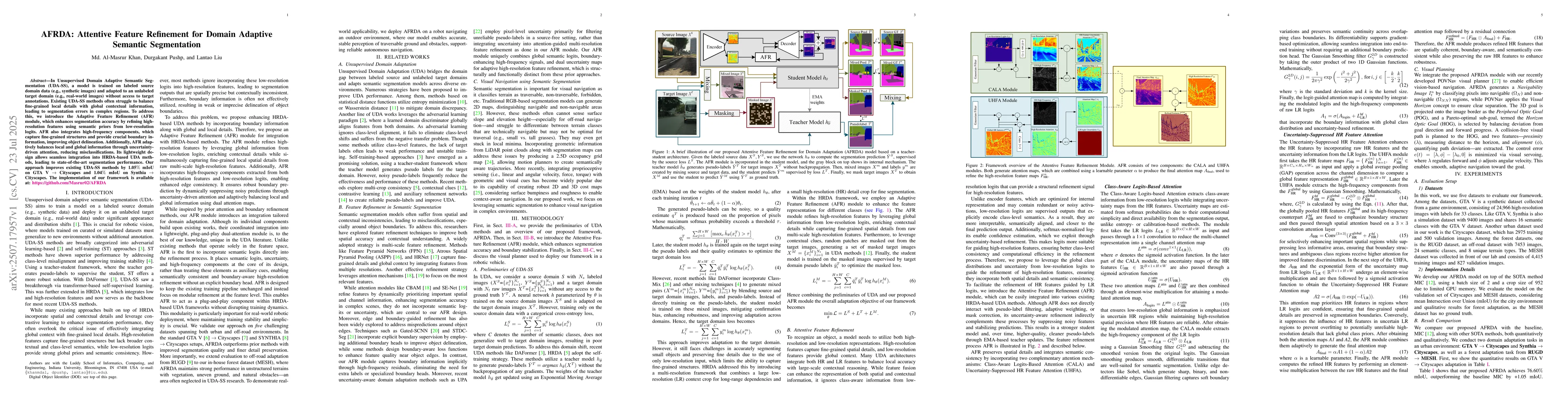 In Unsupervised Domain Adaptive Semantic Segmentation (UDA-SS), a model is trained on labeled source domain data (e.g., synthetic images) and adapted to an unlabeled target domain (e.g., real-world images) without access to target annotations. Existing UDA-SS methods often struggle to balance fine-grained local details with global contextual information, leading to segmentation errors in complex regions. To address this, we introduce the Adaptive Feature Refinement (AFR) module, which enhances segmentation accuracy by refining highresolution features using semantic priors from low-resolution logits. AFR also integrates high-frequency components, which capture fine-grained structures and provide crucial boundary information, improving object delineation. Additionally, AFR adaptively balances local and global information through uncertaintydriven attention, reducing misclassifications. Its lightweight design allows seamless integration into HRDA-based UDA methods, leading to state-of-the-art segmentation performance. Our approach improves existing UDA-SS methods by 1.05% mIoU on GTA V --> Cityscapes and 1.04% mIoU on Synthia-->Cityscapes. The implementation of our framework is available at: https://github.com/Masrur02/AFRDA