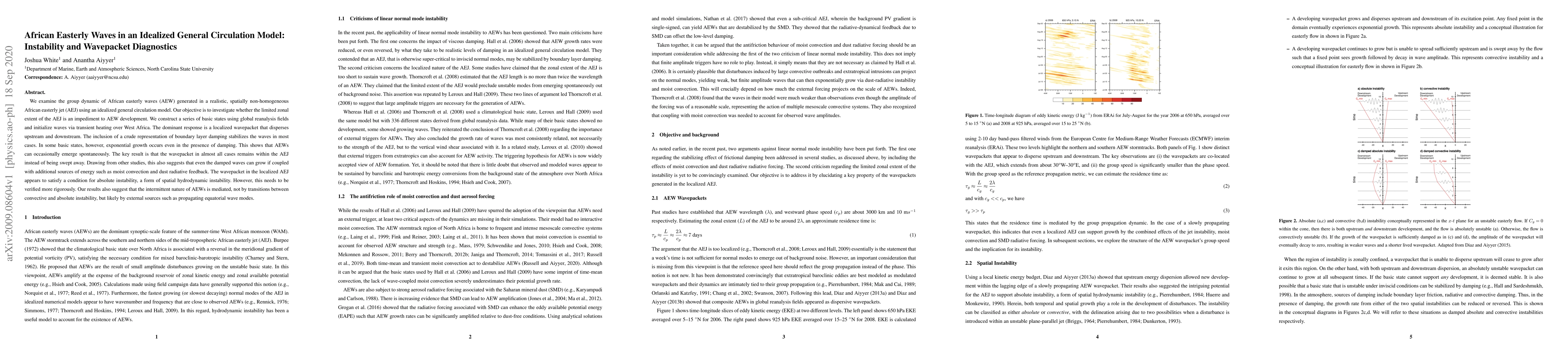 This paper investigates the dynamics of African easterly waves (AEW) using an idealized general circulation model, finding that AEWs can develop spontaneously within a limited zonal extent of the African easterly jet (AEJ). The study reveals that AEW wavepackets often remain within the AEJ, suggesting a condition for absolute instability, though further verification is needed.