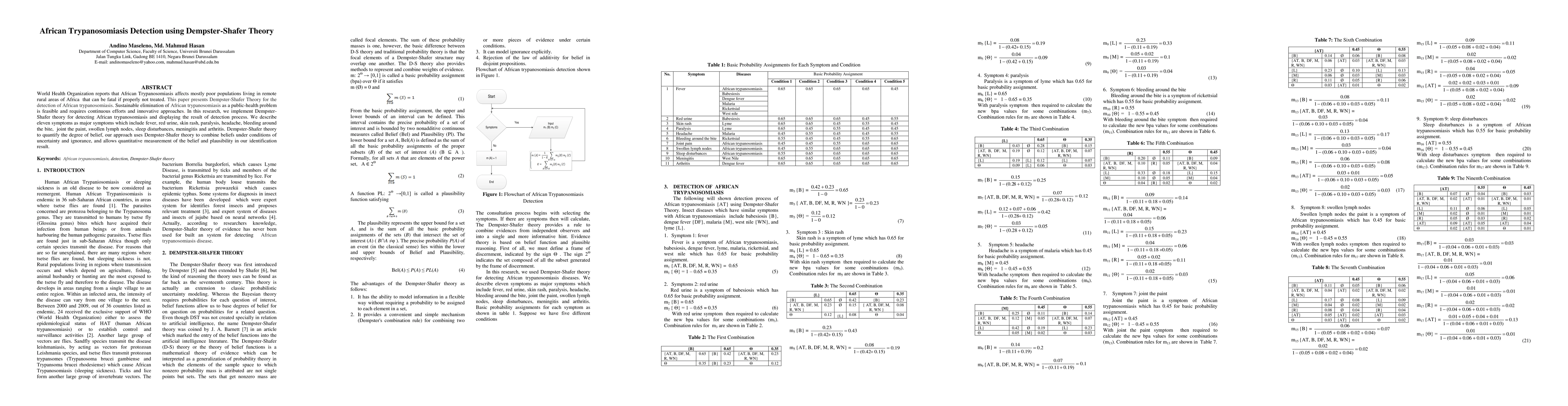 This paper proposes using Dempster-Shafer Theory to detect African Trypanosomiasis, focusing on eleven major symptoms. The approach combines beliefs under uncertainty to quantitatively measure belief and plausibility in identification results, aiming for sustainable elimination of the disease.