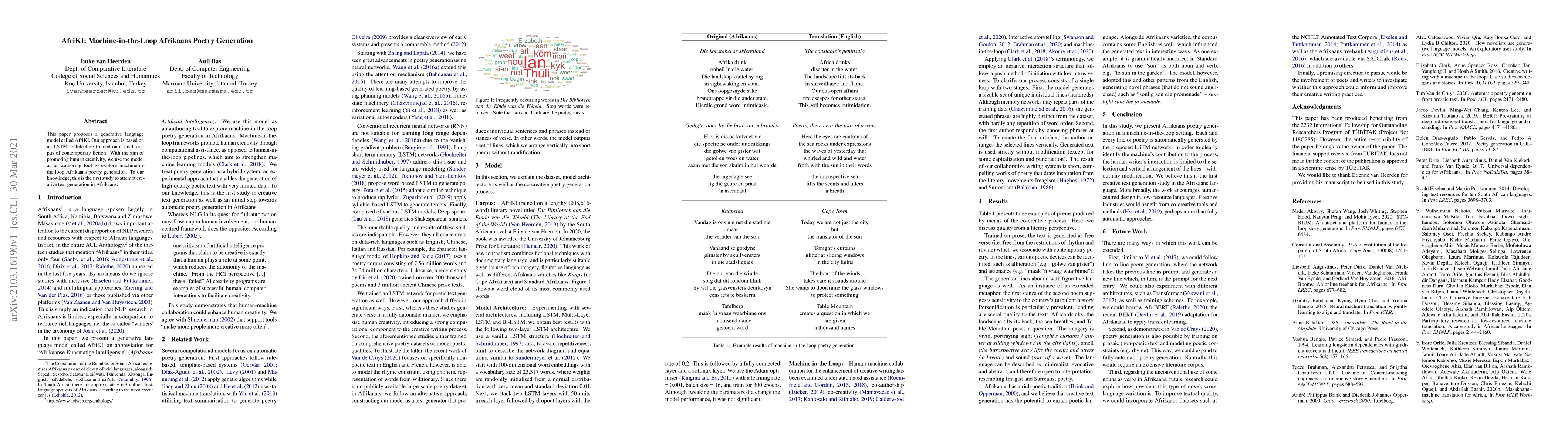Summary: This paper introduces AfriKI, a generative language model based on LSTM architecture, trained to generate Afrikaans poetry. It aims to enhance human creativity and represents the first attempt at creative text generation in Afrikaans.