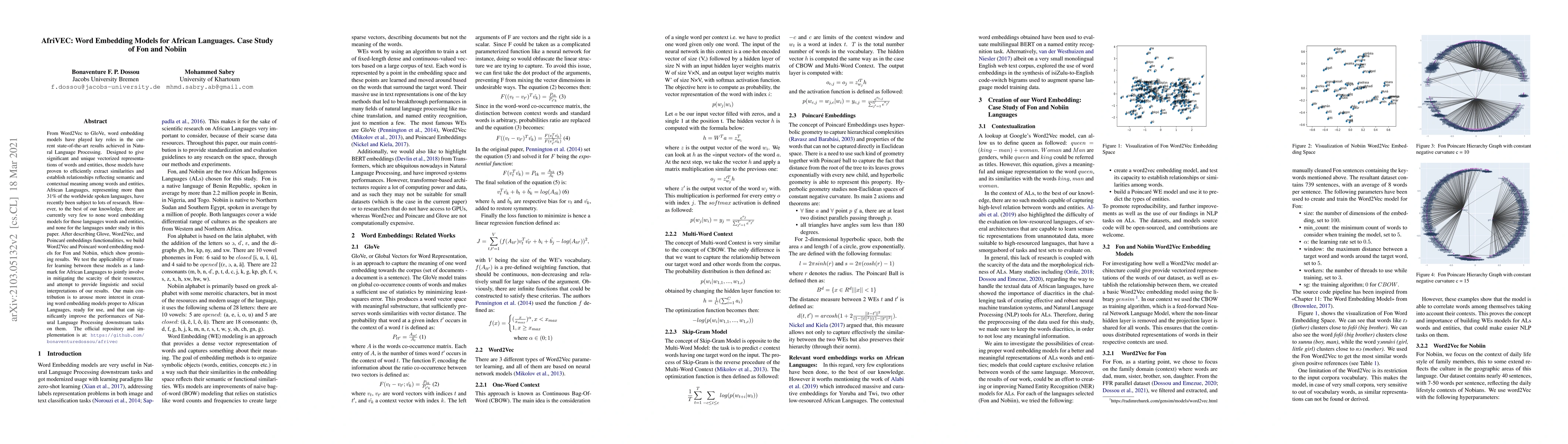 This paper develops word embedding models for the African languages Fon and Nobiin using Word2Vec and Poincar\'e embeddings, aiming to address the scarcity of resources for African languages in Natural Language Processing. The study tests transfer learning between the models and provides linguistic interpretations, highlighting the potential for collaborative efforts to enhance NLP tasks for African languages.