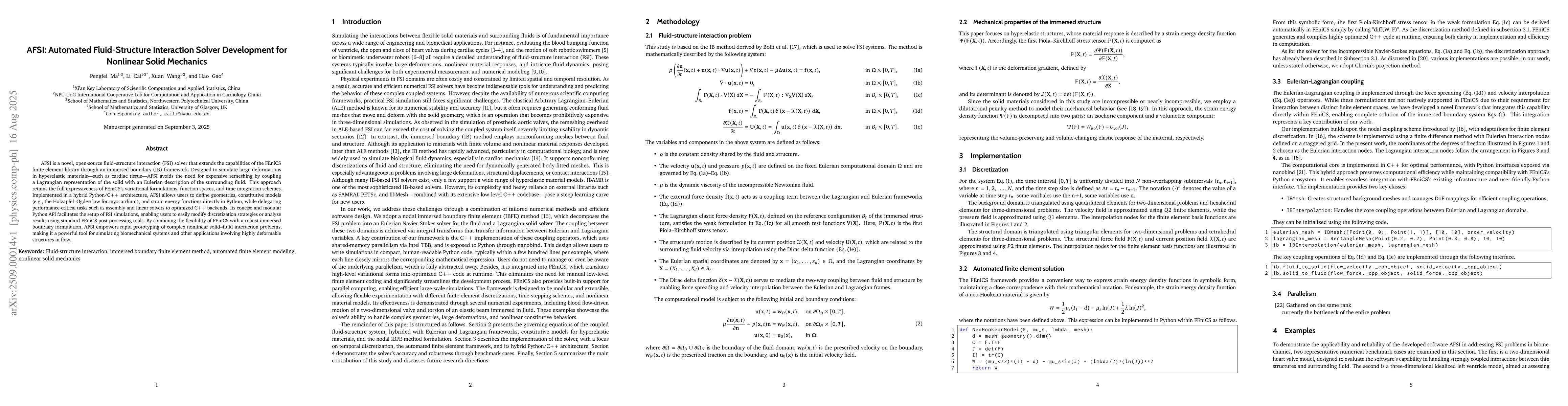 AFSI is a novel, open-source fluid-structure interaction (FSI) solver that extends the capabilities of the FEniCS finite element library through an immersed boundary (IB) framework. Designed to simulate large deformations in hyperelastic materials (such as cardiac tissue), AFSI avoids the need for expensive remeshing by coupling a Lagrangian representation of the solid with an Eulerian description of the surrounding fluid. This approach retains the full expressiveness of FEniCS's variational formulations, function spaces, and time integration schemes. Implemented in a hybrid Python/C++ architecture, AFSI allows users to define geometries, constitutive models (e.g., the Holzapfel-Ogden law for myocardium), and strain energy functions directly in Python, while delegating performance-critical tasks such as assembly and linear solvers to optimized C++ backends. Its concise and modular Python API facilitates the setup of FSI simulations, enabling users to easily modify discretization strategies or analyze results using standard FEniCS post-processing tools. By combining the flexibility of FEniCS with a robust immersed boundary formulation, AFSI empowers rapid prototyping of complex nonlinear solid-fluid interaction problems, making it a powerful tool for simulating biomechanical systems and other applications involving highly deformable structures in flow.