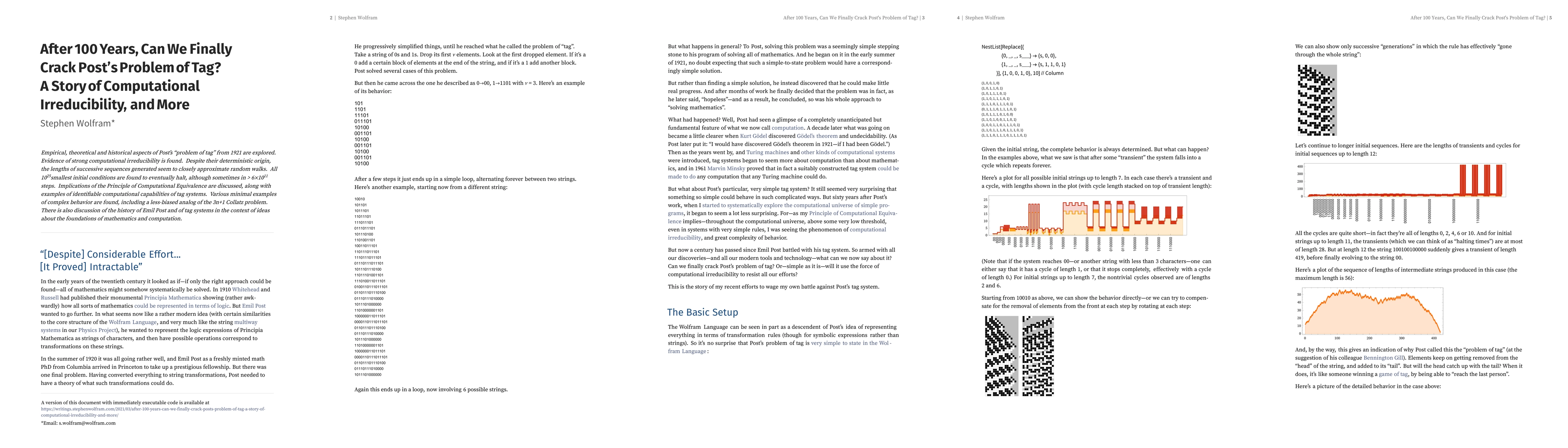 Empirical, theoretical and historical aspects of Post's "problem of tag" from 1921 are explored. Evidence of strong computational irreducibility is found. Despite their deterministic origin, the lengths of successive sequences generated seem to closely approximate random walks. All 10^25 smallest initial conditions are found to eventually halt, although sometimes in > 6*10^11 steps. Implications of the Principle of Computational Equivalence are discussed, along with examples of identifiable computational capabilities of tag systems. Various minimal examples of complex behavior are found, including a less-biased analog of the 3n+1 Collatz problem. There is also discussion of the history of Emil Post and of tag systems in the context of ideas about the foundations of mathematics and computation.