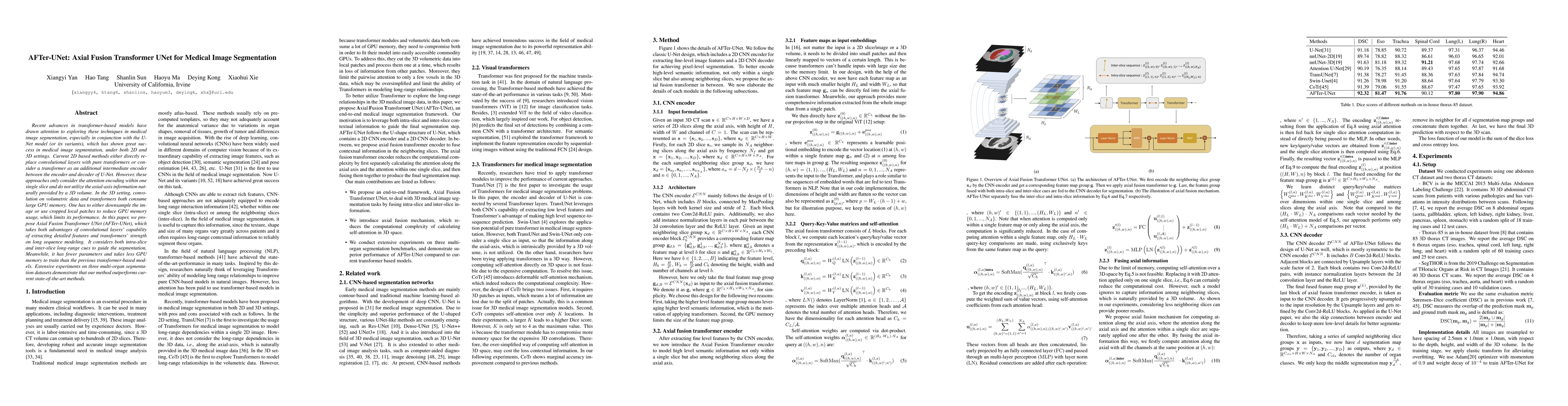 The paper proposes Axial Fusion Transformer UNet (AFTer-UNet) for medical image segmentation, combining convolutional layers and transformers to leverage detailed feature extraction and long-range contextual information. It outperforms existing methods on multi-organ segmentation datasets while requiring fewer parameters and less GPU memory.