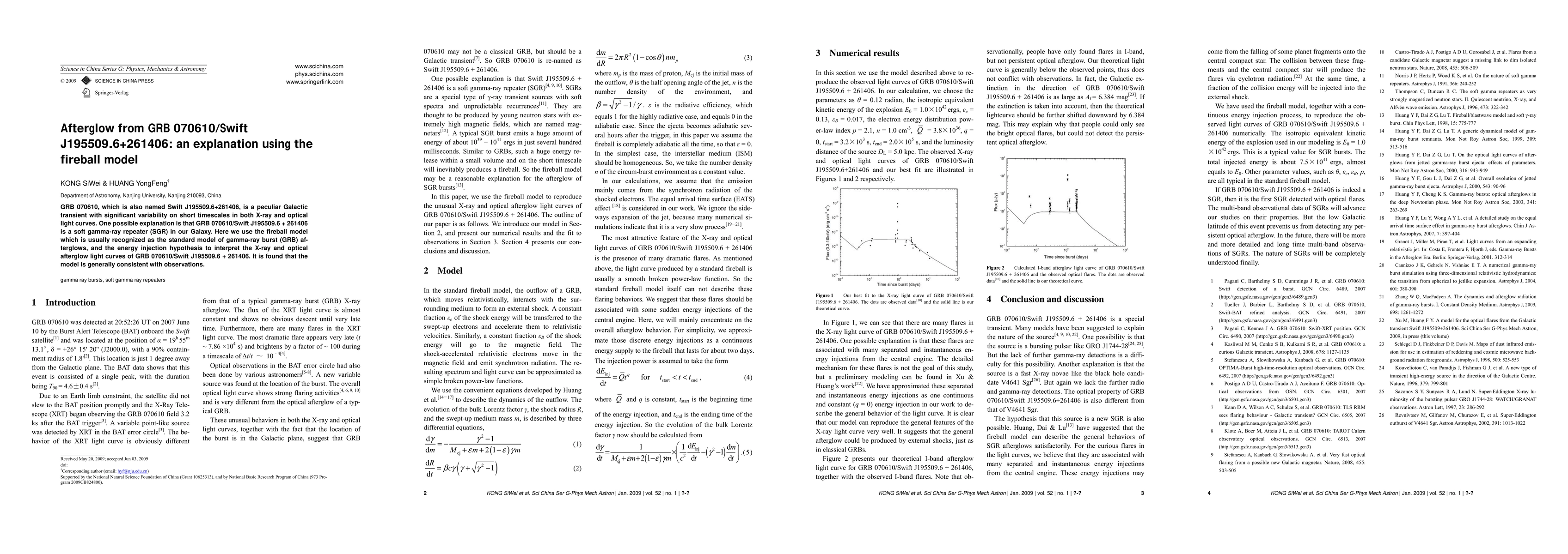 GRB 070610, which is also named Swift J195509.6+261406, is a peculiar Galactic transient with significant variability on short timescales in both X-ray and optical light curves. One possible explanation is that GRB 070610/Swift J195509.6 + 261406 is a soft gamma-ray repeater (SGR) in our Galaxy. Here we use the fireball model which is usually recognized as the standard model of gamma-ray burst (GRB) afterglows, and the energy injection hypothesis to interpret the X-ray and optical afterglow light curves of GRB 070610/Swift J195509.6 + 261406. It is found that the model is generally consistent with observations.