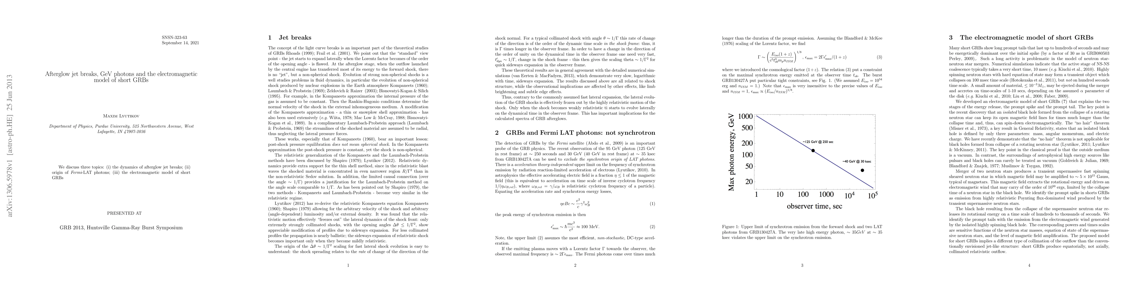 This paper explores the dynamics of afterglow jet breaks in short gamma-ray bursts (GRBs), investigates the origin of GeV photons detected by Fermi-LAT, and proposes an electromagnetic model to explain the phenomena observed in short GRBs.
