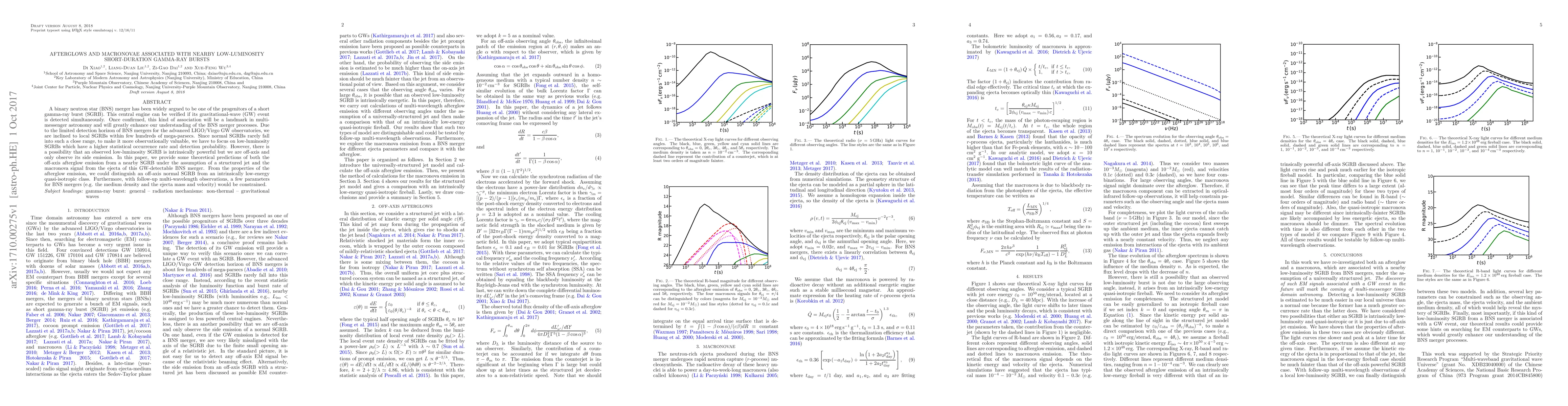 A binary neutron star (BNS) merger has been widely argued to be one of the progenitors of a short gamma-ray burst (SGRB). This central engine can be verified if its gravitational-wave (GW) event is detected simultaneously. Once confirmed, this kind of association will be a landmark in multi-messenger astronomy and will greatly enhance our understanding of the BNS merger processes. Due to the limited detection horizon of BNS mergers for the advanced LIGO/Virgo GW observatories, we are inclined to local SGRBs within few hundreds of mega-parsecs. Since normal SGRBs rarely fall into such a close range, to make it more observationally valuable, we have to focus on low-luminosity SGRBs which have a higher statistical occurrence rate and detection probability. However, there is a possibility that an observed low-luminosity SGRB is intrinsically powerful but we are off-axis and only observe its side emission. In this paper, we provide some theoretical predictions of both the off-axis afterglow emission from a nearby SGRB under the assumption of a structured jet and the macronova signal from the ejecta of this GW-detectable BNS merger. From the properties of the afterglow emission, we could distinguish an off-axis normal SGRB from an intrinsically low-energy quasi-isotropic class. Furthermore, with follow-up multi-wavelength observations, a few parameters for BNS mergers (e.g. the medium density and the ejecta mass and velocity) would be constrained.