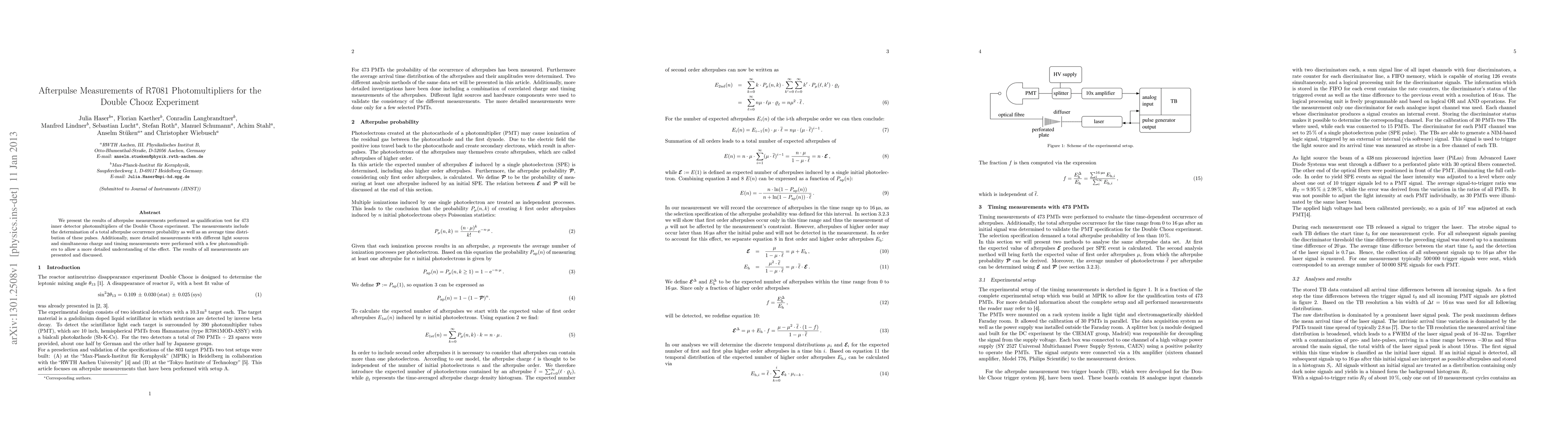 The study details afterpulse measurements on 473 photomultipliers for the Double Chooz experiment, determining their total afterpulse probability and timing distribution. Additional detailed measurements with various light sources and simultaneous charge/timing assessments on a few PMTs were conducted for better understanding, with all results thoroughly discussed.