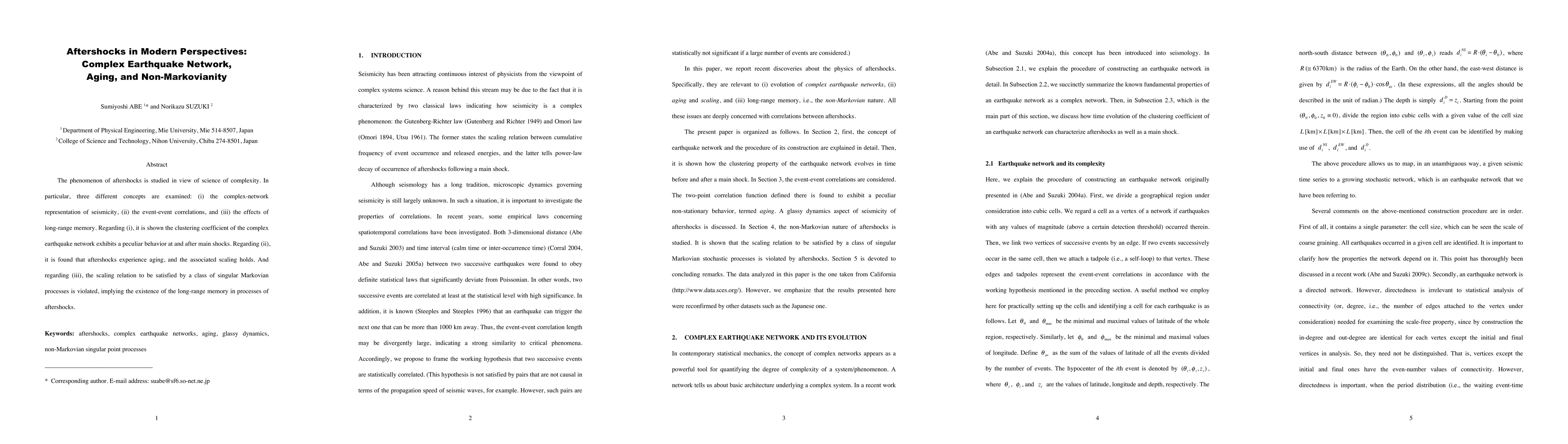 The paper investigates aftershock phenomena through the lens of complexity science, focusing on complex-network representation, event-event correlations, and the role of long-range memory, revealing peculiar network behaviors, aging effects in aftershocks, and deviations from Markovian processes indicating long-range memory.
