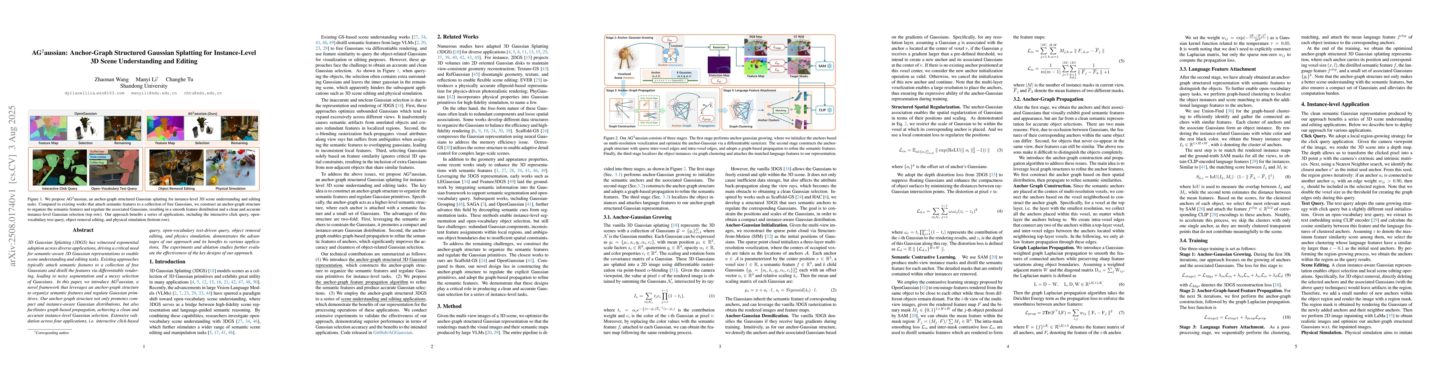 3D Gaussian Splatting (3DGS) has witnessed exponential adoption across diverse applications, driving a critical need for semantic-aware 3D Gaussian representations to enable scene understanding and editing tasks. Existing approaches typically attach semantic features to a collection of free Gaussians and distill the features via differentiable rendering, leading to noisy segmentation and a messy selection of Gaussians. In this paper, we introduce AG$^2$aussian, a novel framework that leverages an anchor-graph structure to organize semantic features and regulate Gaussian primitives. Our anchor-graph structure not only promotes compact and instance-aware Gaussian distributions, but also facilitates graph-based propagation, achieving a clean and accurate instance-level Gaussian selection. Extensive validation across four applications, i.e. interactive click-based query, open-vocabulary text-driven query, object removal editing, and physics simulation, demonstrates the advantages of our approach and its benefits to various applications. The experiments and ablation studies further evaluate the effectiveness of the key designs of our approach.