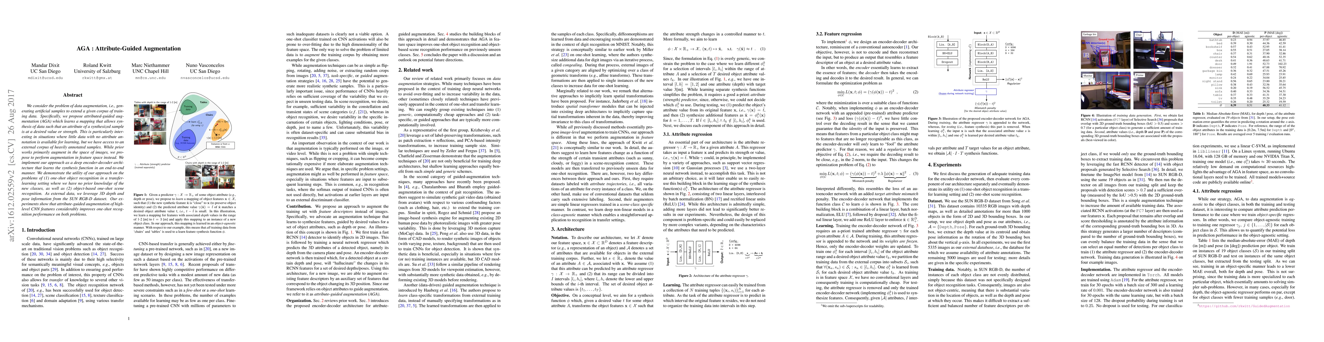 The paper introduces Attribute Guided Augmentation (AGA), a method for generating synthetic data samples that control specific attributes to enhance training data. This approach synthesizes data in feature space rather than image space, using a deep encoder-decoder architecture to learn the synthesis function. The method is demonstrated to improve one-shot object and scene recognition tasks, leveraging heavily annotated external data from the SUN RGB-D dataset.