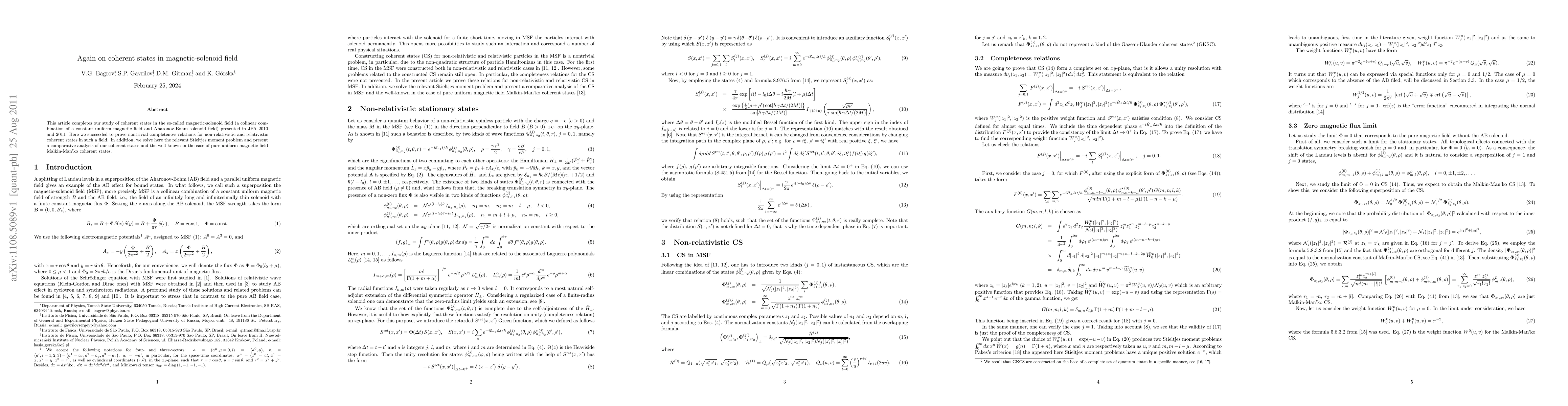 This paper completes a study on coherent states in magnetic-solenoid fields, proving nontrivial completeness relations for both non-relativistic and relativistic cases, and solving the Stieltjes moment problem, while comparing these findings to Malkin-Man'ko coherent states in uniform magnetic fields.