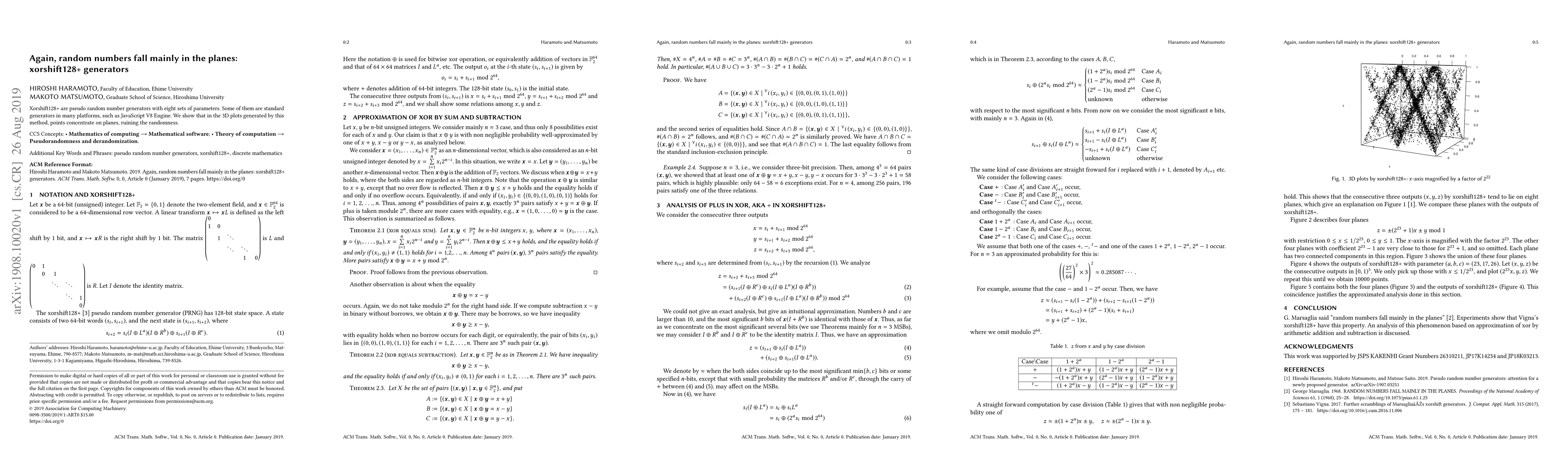 Xorshift128+ are pseudo random number generators with eight sets of parameters. Some of them are standard generators in many platforms, such as JavaScript V8 Engine. We show that in the 3D plots generated by this method, points concentrate on planes, ruining the randomness.