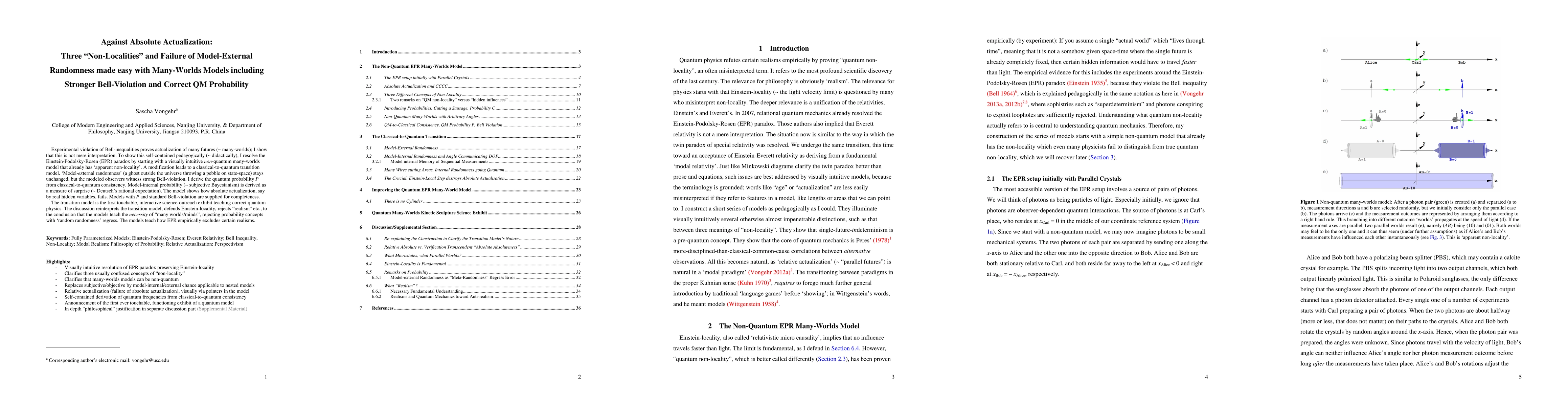 Experimental violation of Bell-inequalities proves actualization of many futures (~ many-worlds); I show that this is not mere interpretation. To show this self-contained pedagogically, I resolve the EPR paradox by starting with a visually intuitive non-quantum many-worlds model that already has apparent non-locality. A modification leads to a classical-to-quantum transition model. Model-external randomness (a ghost outside the universe throwing a pebble on state-space) stays unchanged, but the modeled observers witness strong Bell-violation. I derive the quantum probability P from classical-to-quantum consistency. Model-internal probability (~ subjective Bayesianism) is derived as a measure of surprise (~ Deutsch's rational expectation). The model shows how absolute actualization, say by real hidden variables, fails. Models with P and standard Bell-violation are supplied for completeness. The transition model is the first touchable, interactive science-outreach exhibit teaching correct quantum physics. The discussion reinterprets the transition model, defends Einstein-locality, rejects "realism" etc., to the conclusion that the models teach the necessity of "many worlds/minds", rejecting probability concepts with random-randomness regress. The models teach how EPR empirically excludes certain realisms.