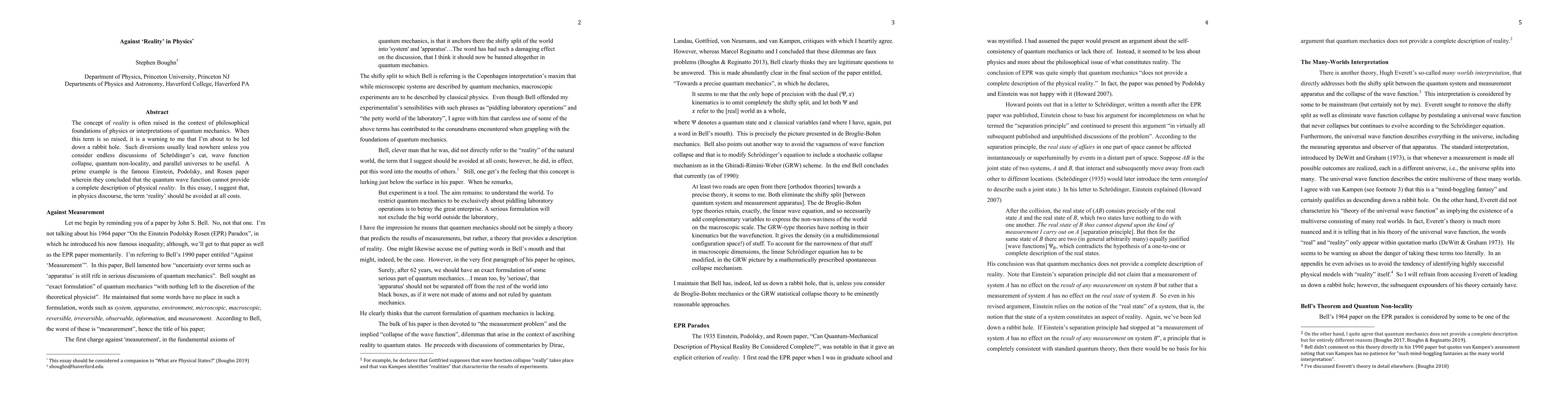 The concept of "reality" is often raised in the context of philosophical foundations of physics or interpretations of quantum mechanics. When this term is so raised, it is a warning to me that I am about to be led down a rabbit hole. Such diversions usually lead nowhere unless you consider endless discussions of Schrodinger's cat, wave function collapse, quantum non-locality, and parallel universes to be useful. A prime example is the famous Einstein, Podolsky, and Rosen paper wherein they concluded that the quantum wave function cannot provide a complete description of physical reality. In this essay I suggest that, in physics discourse, the term "reality" should be avoided at all costs.