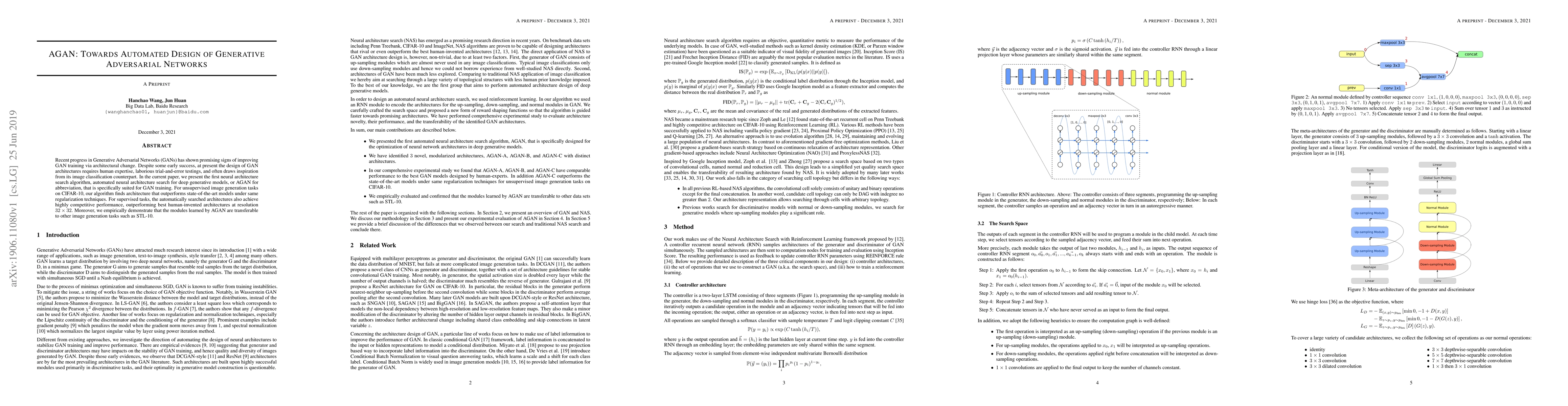 A new algorithm called AGAN automatically designs Generative Adversarial Networks for image generation tasks, achieving competitive performance with human-designed architectures and transferring well to other tasks.