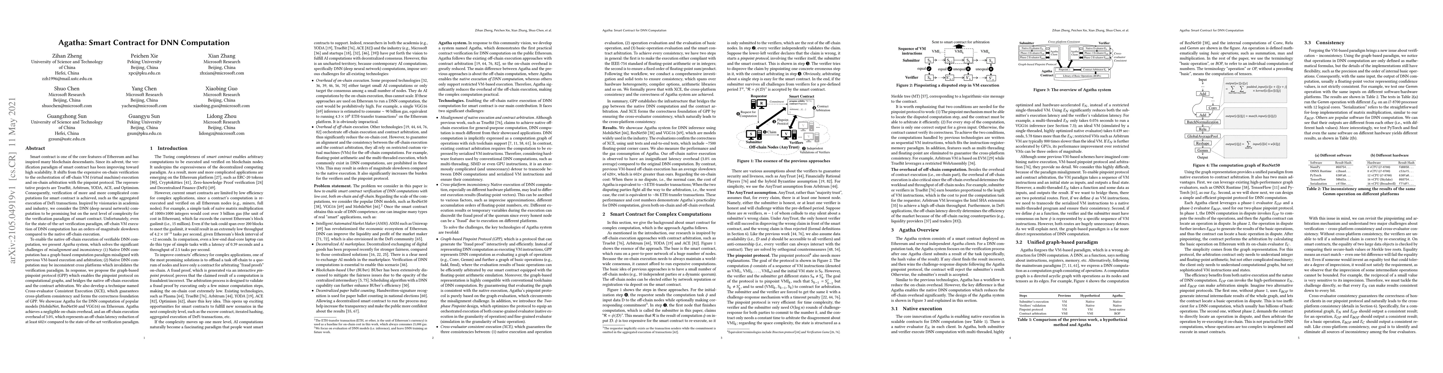 Smart contract is one of the core features of Ethereum and has inspired many blockchain descendants. Since its advent, the verification paradigm of smart contract has been improving toward high scalability. It shifts from the expensive on-chain verification to the orchestration of off-chain VM (virtual machine) execution and on-chain arbitration with the pinpoint protocol. The representative projects are TrueBit, Arbitrum, YODA, ACE, and Optimism. Inspired by visionaries in academia and industry, we consider the DNN computation to be promising but on the next level of complexity for the verification paradigm of smart contract. Unfortunately, even for the state-of-the-art verification paradigm, off-chain VM execution of DNN computation has an orders-of-magnitude slowdown compared to the native off-chain execution. To enable the native off-chain execution of verifiable DNN computation, we present Agatha system, which solves the significant challenges of misalignment and inconsistency: (1) Native DNN computation has a graph-based computation paradigm misaligned with previous VM-based execution and arbitration; (2) Native DNN computation may be inconsistent cross platforms which invalidates the verification paradigm. In response, we propose the graph-based pinpoint protocol (GPP) which enables the pinpoint protocol on computational graphs, and bridges the native off-chain execution and the contract arbitration. We also develop a technique named Cross-evaluator Consistent Execution (XCE), which guarantees cross-platform consistency and forms the correctness foundation of GPP. We showcase Agatha for the DNN computation of popular models (MobileNet, ResNet50 and VGG16) on Ethereum. Agatha achieves a negligible on-chain overhead, and an off-chain execution overhead of 3.0%, which represents an off-chain latency reduction of at least 602x compared to the state-of-the-art verification paradigm.