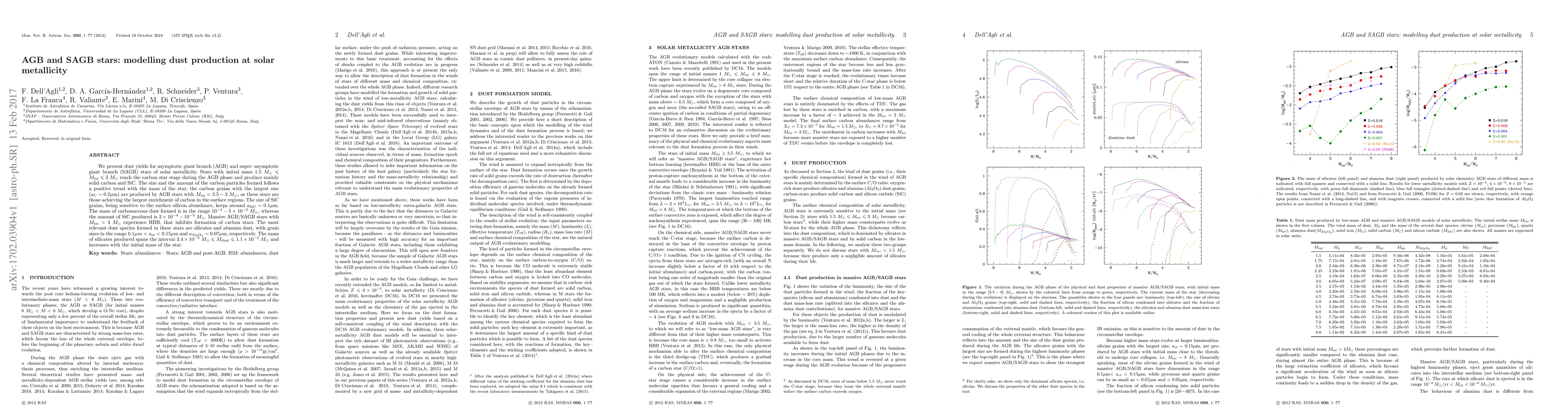 We present dust yields for asymptotic giant branch (AGB) and super--asymptotic giant branch (SAGB) stars of solar metallicity. Stars with initial mass $1.5~M_{\odot} \leq M_{\rm ini} \leq 3~M_{\odot}$ reach the carbon star stage during the AGB phase and produce mainly solid carbon and SiC. The size and the amount of the carbon particles formed follows a positive trend with themass of the star; the carbon grains with the largest size ($a_{\rm C} \sim 0.2\mu$m) are produced by AGB stars with $M_{\rm ini} = 2.5-3~M_{\odot}$, as these stars are those achieving the largest enrichment of carbon in the surface regions. The size of SiC grains, being sensitive to the surface silicon abundance, keeps around $a_{\rm SiC} \sim 0.1\mu$m. The mass of carbonaceous dust formed is in the range $10^{-4} - 5\times 10^{-3}~M_{\odot}$, whereas the amount of SiC produced is $2\times 10^{-4} - 10^{-3}~M_{\odot}$. Massive AGB/SAGB stars with $M_{\rm ini} > 3~M_{\odot}$ experience HBB, that inhibits formation of carbon stars. The most relevant dust species formed in these stars are silicates and alumina dust, with grain sizes in the range $0.1\mu m < a_{\rm ol} < 0.15\mu$m and $a_{\rm Al_2O_3} \sim 0.07\mu$m, respectively. The mass of silicates produced spans the interval $3.4\times 10^{-3}~M_{\odot} \leq M_{\rm dust} \leq 1.1\times 10^{-2}~M_{\odot}$ and increases with the initial mass of the star.