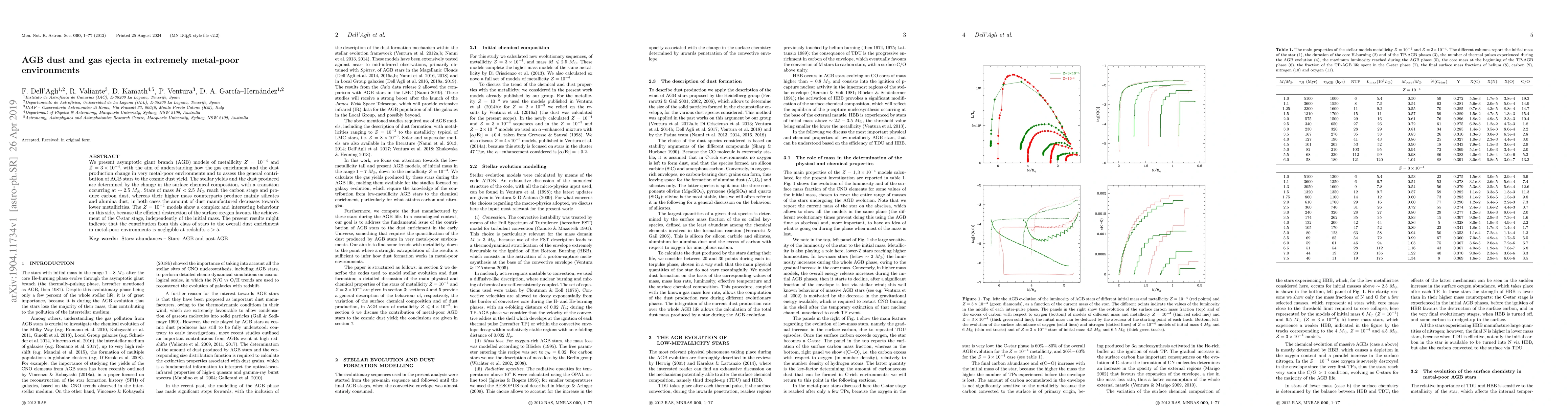 We present asymptotic giant branch (AGB) models of metallicity $Z=10^{-4}$ and $Z=3\times 10^{-4}$, with the aim of understanding how the gas enrichment and the dust production change in very metal-poor environments and to assess the general contribution of AGB stars to the cosmic dust yield. The stellar yields and the dust produced are determined by the change in the surface chemical composition, with a transition occurring at $\sim 2.5~M_{\odot}$. Stars of mass $M < 2.5~M_{\odot}$ reach the carbon stage and produce carbon dust, whereas their higher mass counterparts produce mainly silicates and alumina dust; in both cases the amount of dust manufactured decreases towards lower metallicities. The $Z=10^{-4}$ models show a complex and interesting behaviour on this side, because the efficient destruction of the surface oxygen favours the achievement of the C-star stage, independently of the initial mass. The present results might indicate that the contribution from this class of stars to the overall dust enrichment in metal-poor environments is negligible at redshifts $z>5$.