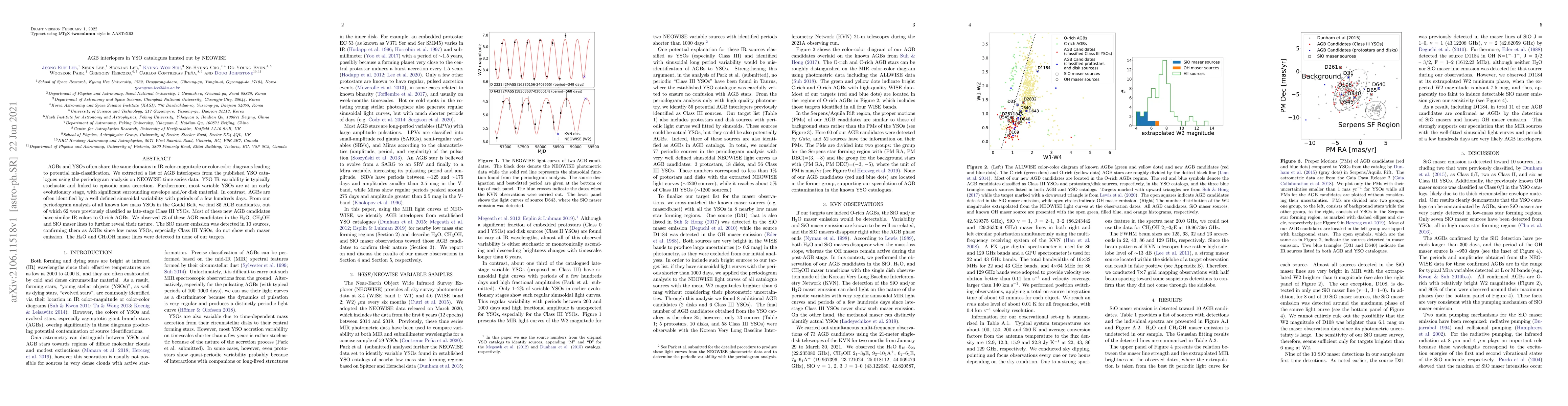 AGBs and YSOs often share the same domains in IR color-magnitude or color-color diagrams leading to potential mis-classification. We extracted a list of AGB interlopers from the published YSO catalogues using the periodogram analysis on NEOWISE time series data. YSO IR variability is typically stochastic and linked to episodic mass accretion. Furthermore, most variable YSOs are at an early evolutionary stage, with significant surrounding envelope and/or disk material. In contrast, AGBs are often identified by a well defined sinusoidal variability with periods of a few hundreds days. From our periodogram analysis of all known low mass YSOs in the Gould Belt, we find 85 AGB candidates, out of which 62 were previously classified as late-stage Class III YSOs. Most of these new AGB candidates have similar IR colors to O-rich AGBs. We observed 73 of these AGB candidates in the H2O, CH3OH and SiO maser lines to further reveal their nature. The SiO maser emission was detected in 10 sources, confirming them as AGBs since low mass YSOs, especially Class III YSOs, do not show such maser emission. The H2O and CH3OH maser lines were detected in none of our targets.