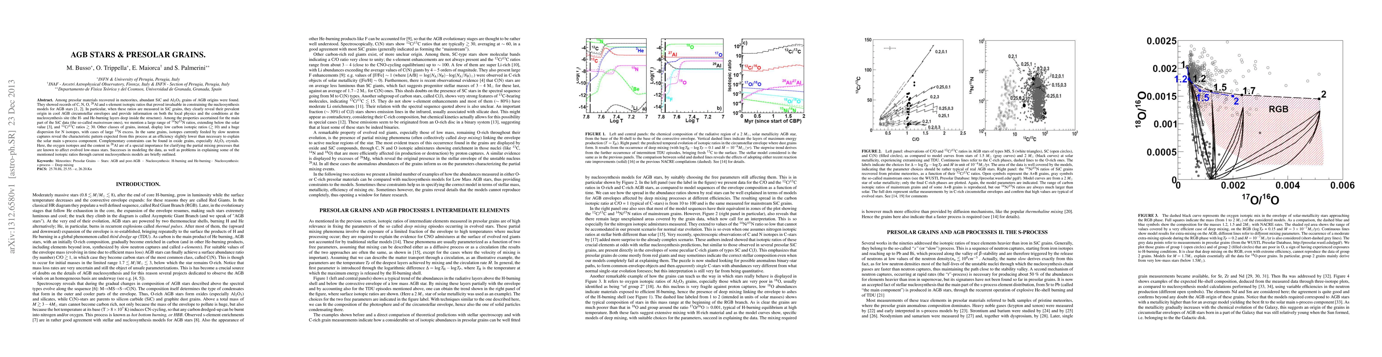 Among presolar materials recovered in meteorites, abundant SiC and Al$_{2}$O$_{3}$ grains of AGB origins were found. They showed records of C, N, O, $^{26}$Al and s-element isotopic ratios that proved invaluable in constraining the nucleosynthesis models for AGB stars \cite{zin,gal}. In particular, when these ratios are measured in SiC grains, they clearly reveal their prevalent origin in cool AGB circumstellar envelopes and provide information on both the local physics and the conditions at the nucleosynthesis site (the H- and He-burning layers deep inside the structure). Among the properties ascertained for the main part of the SiC data (the so-called {\it mainstream} ones), we mention a large range of $^{14}$N/$^{15}$N ratios, extending below the solar value \cite{mar}, and $^{12}$C/$^{13}$C ratios $\gtrsim$ 30. Other classes of grains, instead, display low carbon isotopic ratios ($\gtrsim 10$) and a huge dispersion for N isotopes, with cases of large $^{15}$N excess. In the same grains, isotopes currently feeded by slow neutron captures reveal the characteristic pattern expected from this process at an efficiency slightly lower than necessary to explain the solar main s-process component. Complementary constraints can be found in oxide grains, especially Al$_{2}$O$_{3}$ crystals. Here, the oxygen isotopes and the content in $^{26}$Al are of a special importance for clarifying the partial mixing processes that are known to affect evolved low-mass stars. Successes in modeling the data, as well as problems in explaining some of the mentioned isotopic ratios through current nucleosynthesis models are briefly outlined.