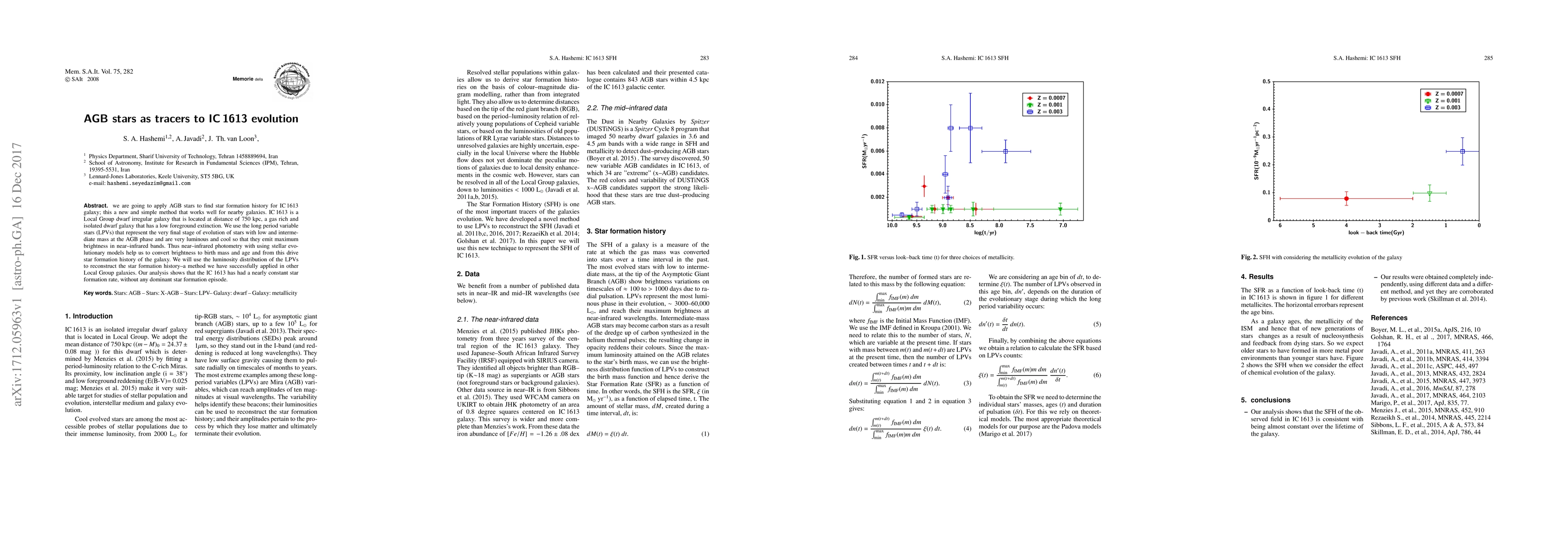 The research applies Asymptotic Giant Branch (AGB) stars, specifically Long Period Variable stars (LPVs), to determine the star formation history (SFH) of IC 1613, a Local Group dwarf irregular galaxy. Near-infrared photometry combined with stellar evolutionary models is used to convert luminosity to birth mass and age, thereby reconstructing the SFH.