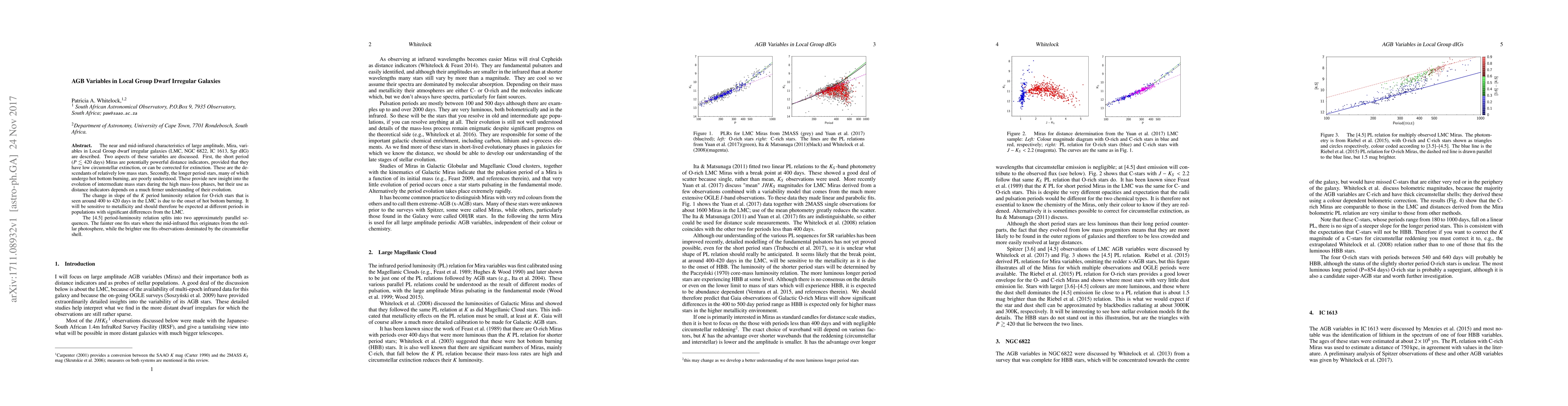 The near and mid-infrared characteristics of large amplitude, Mira, variables in Local Group dwarf irregular galaxies (LMC, NGC 6822, IC 1613, Sgr dIG) are described. Two aspects of these variables are discussed. First, the short period (P < 420 days) Miras are potentially powerful distance indicators, provided that they have low circumstellar extinction, or can be corrected for extinction. These are the descendants of relatively low mass stars. Secondly, the longer period stars, many of which undergo hot bottom burning, are poorly understood. These provide new insight into the evolution of intermediate mass stars during the high mass-loss phases, but their use as distance indicators depends on a much firmer understanding of their evolution. The change in slope of the K period luminosity relation for O-rich stars that is seen around 400 to 420 days in the LMC is due to the onset of hot bottom burning. It will be sensitive to metallicity and should therefore be expected at different periods in populations with significant differences from the LMC. The [4.5] period-luminosity relation splits into two approximately parallel sequences. The fainter one fits stars where the mid-infrared flux originates from the stellar photosphere, while the brighter one fits observations dominated by the circumstellar shell.