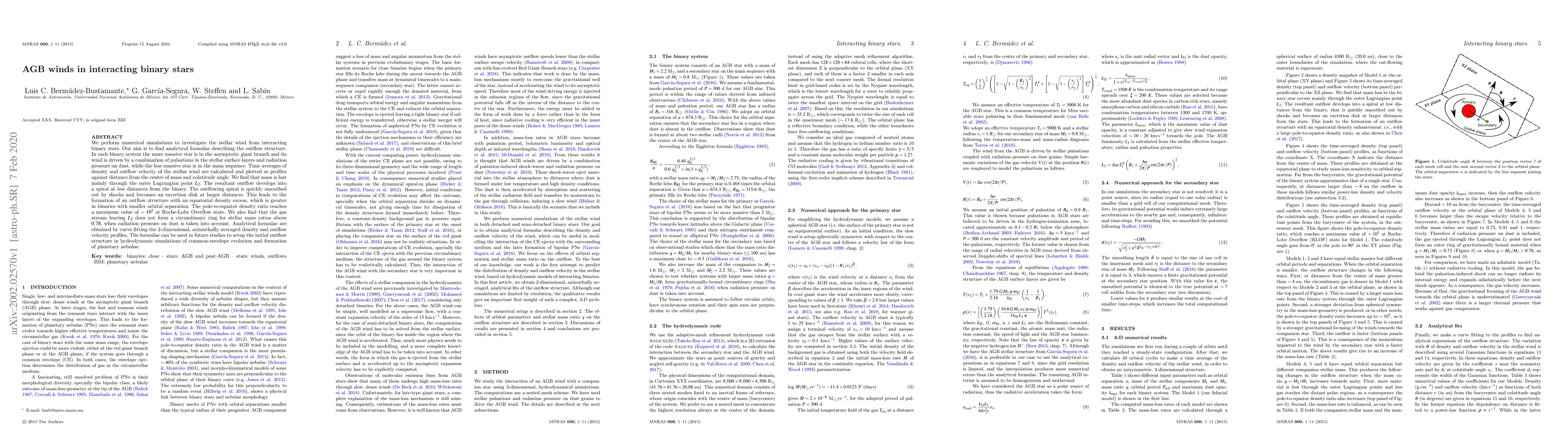 Numerical simulations were performed to investigate the stellar wind from interacting binary stars, with the aim of finding analytical formulae describing the outflow structure. The simulations considered a more massive star in the asymptotic giant branch phase and a less massive main-sequence star, calculating time-averaged density and outflow velocity profiles against distance from the center of mass and colatitude angle.