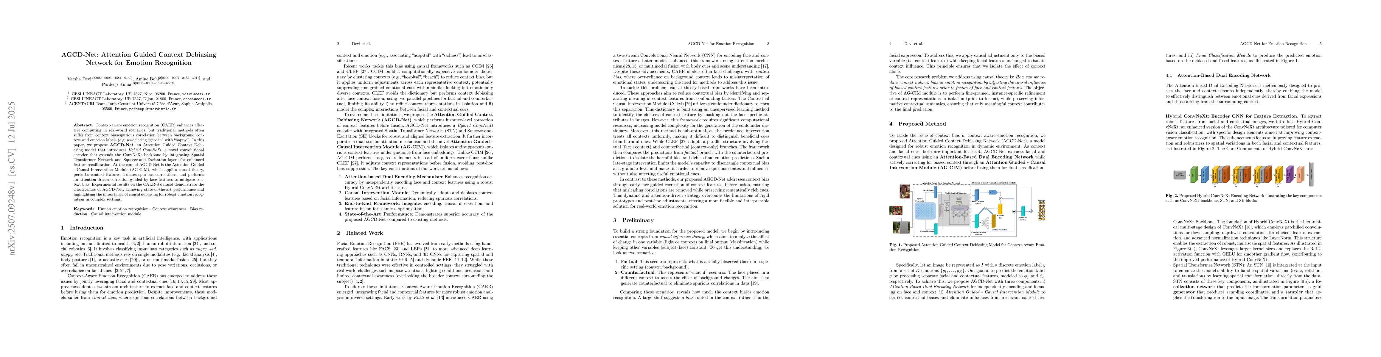 Context-aware emotion recognition (CAER) enhances affective computing in real-world scenarios, but traditional methods often suffer from context bias-spurious correlation between background context and emotion labels (e.g. associating ``garden'' with ``happy''). In this paper, we propose \textbf{AGCD-Net}, an Attention Guided Context Debiasing model that introduces \textit{Hybrid ConvNeXt}, a novel convolutional encoder that extends the ConvNeXt backbone by integrating Spatial Transformer Network and Squeeze-and-Excitation layers for enhanced feature recalibration. At the core of AGCD-Net is the Attention Guided - Causal Intervention Module (AG-CIM), which applies causal theory, perturbs context features, isolates spurious correlations, and performs an attention-driven correction guided by face features to mitigate context bias. Experimental results on the CAER-S dataset demonstrate the effectiveness of AGCD-Net, achieving state-of-the-art performance and highlighting the importance of causal debiasing for robust emotion recognition in complex settings.
